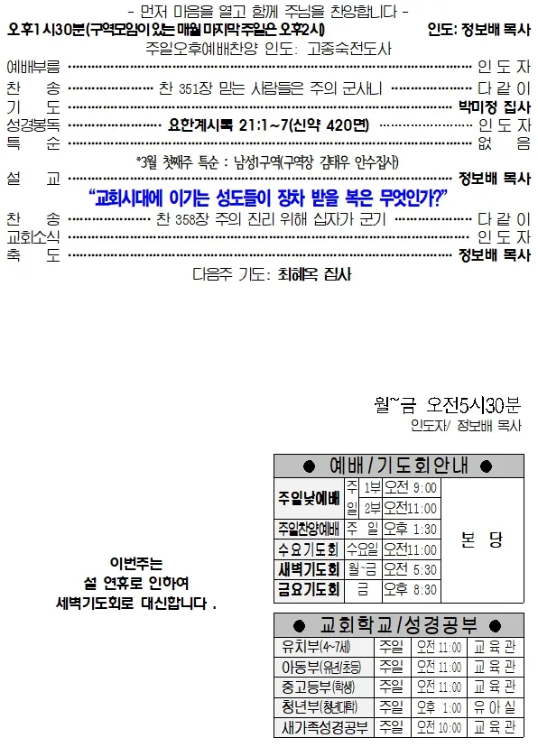 6. 새벽기도회, 수요기도회: 이번주 월~수 새벽기도회는 설연휴로 인하여 <온라인새벽기도회(요한복음강해)>로 드립니다. 수요기도회는 새벽기도회에 대신합니다.