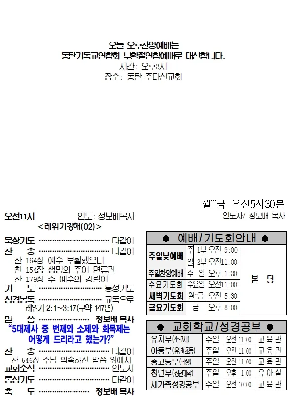4. 오후찬양예배특순: 오늘 오후찬양예배(오후3시)는 동기연부활절연합예배로 대신하기에 없으며, 다음주일은 제6구역(정은이권사)이 담당해주시겠습니다.