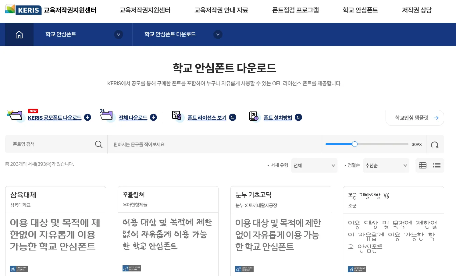 https://copyright.keris.or.kr/wft/fntDwnld 위의 393가지의 글꼴은 누구나 무료로 다운로드 가능하며, 상업용으로 이용가능합니다. 교육저작권지원센터copyright.keris.or.kr교육저작권 안내자료 및 온라인상담, 폰트점검 프로그램 다운로드, 학교 안심폰트 다운로드