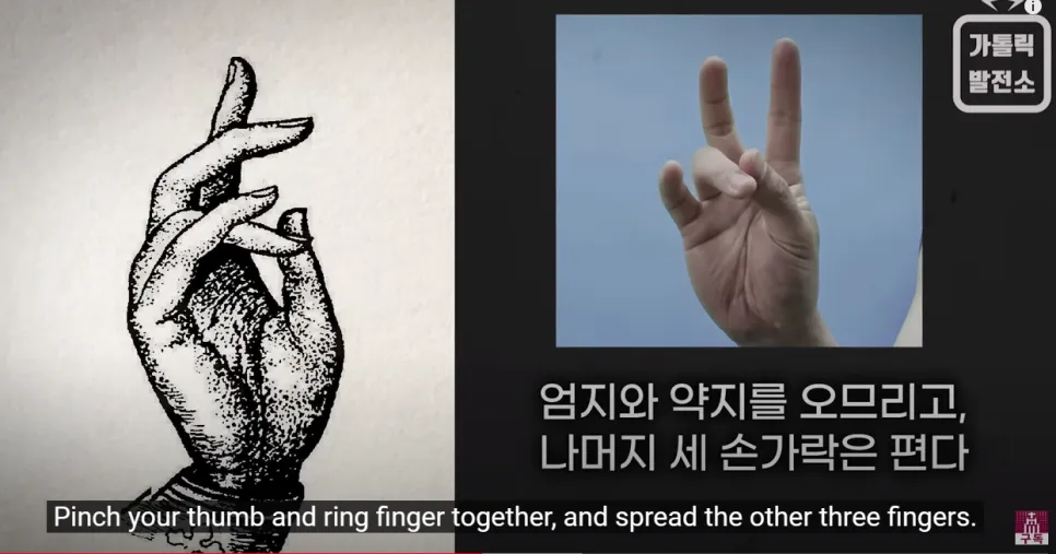 엄지와 약지를 오므리고, 나머지 세 손가락은 편다. 펼친 세 개의 손가락은 ‘삼위일체’를 상징한다.
