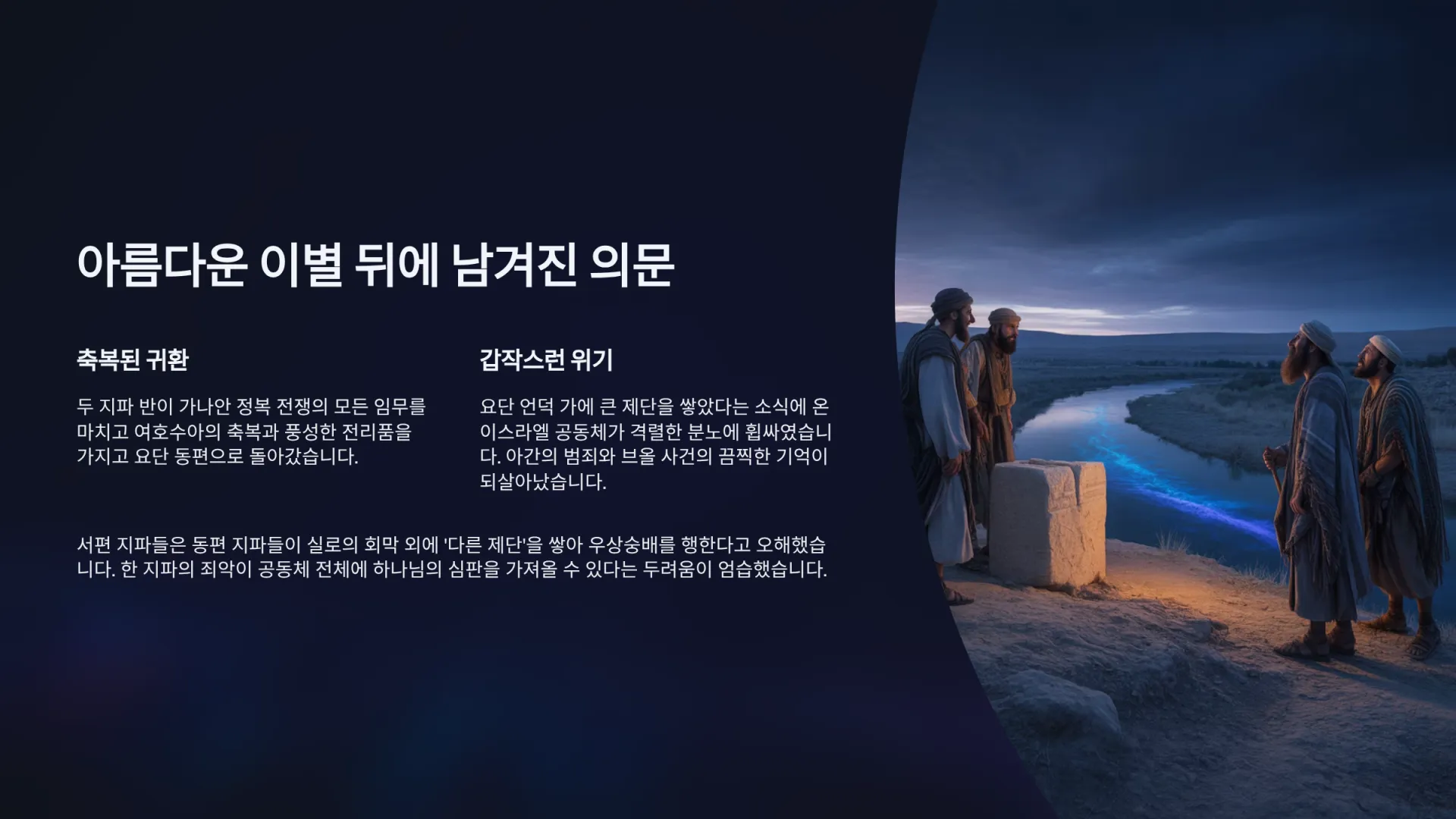 모든 것이 아름답게 마무리되고 축복된 이별인 줄 알았다. 왜냐하면 르우벤, 갓, 므낫세 반지파가 가나안 정복 전쟁의 모든 임무를 마치고, 여호수아의 축복과 풍성한 전리품을 가지고 자신들의 기업인 요단 동편으로 돌아갔기 때문이다(민 22:1-9). 그러나 요단 동편으로 돌아가던 두 지파 반이 요단 언덕 가에 큰 제단을 쌓았다는 소식이 요단 서편의 아홉 지파 반에게 전해진다. 그러자 온 이스라엘 공동체는 격렬한 분노에 휩싸여 내전의 위기까지 치닫게 된다. 왜냐하면 요단 서편의 지파들은 동편 지파들이 하나님께서 지정하신 유일한 성소인 실로의 회막 외에 ‘다른 제단’을 쌓아 우상숭배를 행하고 있다고 오해했기 때문이다. 이는 과거 아간의 범죄와 브올 사건의 끔찍한 기억이 되살아나, 한 개인이나 한 지파의 죄악이 공동체 전체에 하나님의 심판을 가져올 수도 있었기 때문이다.