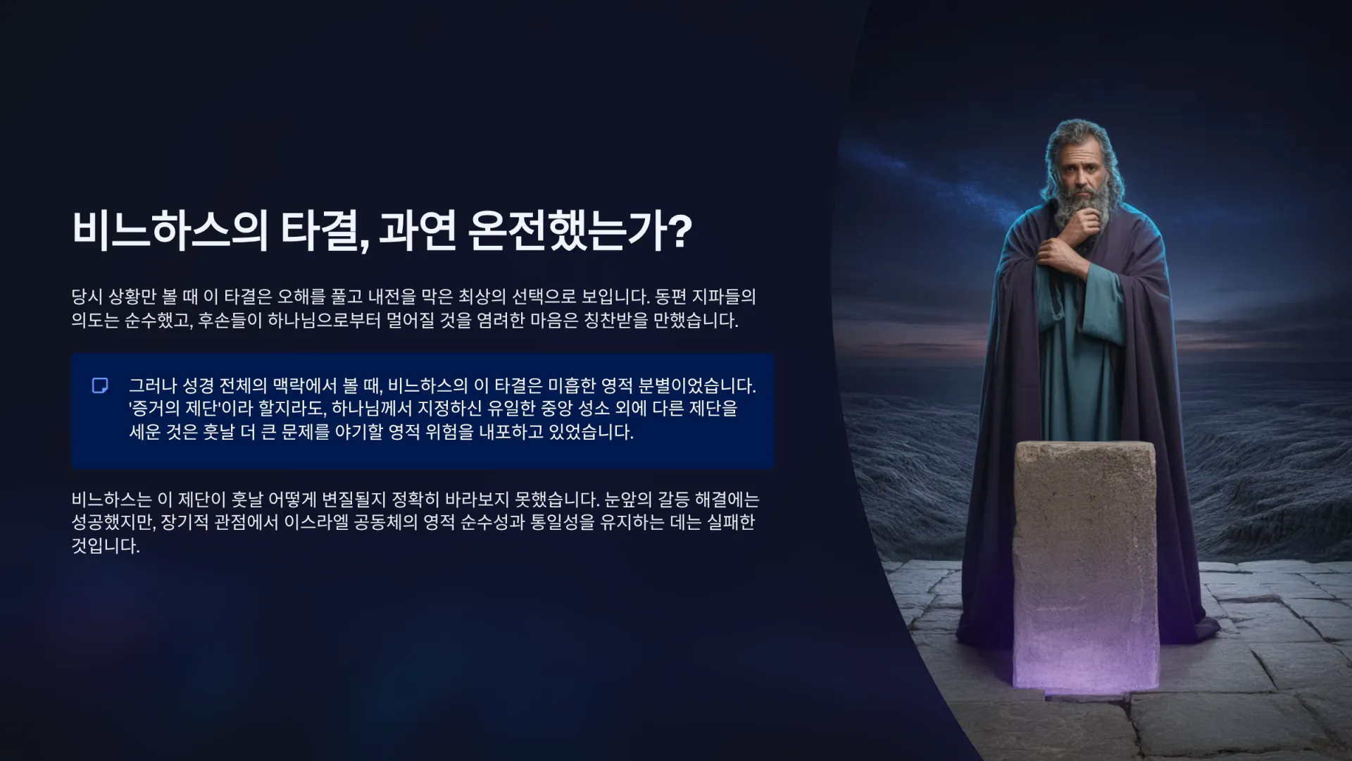 그러나 성경 전체의 맥락에서 볼 때, 비느하스의 이 타결, 곧 엣 제단의 보존은 미흡한 영적 분별이었다고 할 수 있다. 사실 동편 지파들의 의도는 순수했고, 후손들이 하나님으로부터 멀어질 것을 염려한 마음은 칭찬받을 만했다. 그러나 ‘증거의 제단’이라는 형식이라 할지라도, 하나님께서 지정하신 유일한 중앙 성소 외에 다른 제단을 세운 것은 훗날 더 큰 문제를 야기할 수 있는 영적인 위험을 내포하고 있었다. 비느하스는 당시에 이 ‘증거의 제단’이 훗날 어떻게 변질될지 정확히 바라보지 못했다. 눈앞의 오해를 해소하고 전쟁을 막는 것은 성공했지만, 장기적인 관점에서 이스라엘 공동체의 영적 순수성과 통일성을 유지하는 데는 실패한 것이다. 당장의 갈등 해결에 만족하여 영적인 근본 문제를 간과했던 비느하스의 결정은, 훗날 요단 동편 지파들에게 비극적인 파멸로 이어지는 씨앗이 된 것이다.