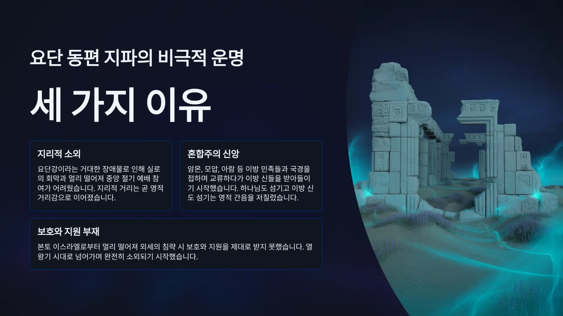 첫째, 이들은 지리적 거리로 볼 때 늘 소외를 받아야 했기 때문이다. 요단 동편 지파들은 지리적으로 요단강이라는 거대한 장애물로 인해 서편의 중앙 성소(실로)와 멀리 떨어져 있었다. 이것은 그들이 실로의 회막에서 드려지는 중앙 절기 예배에 참여하기 어렵게 만들었고, 결국 하나님과의 영적인 교류에서 소외되는 결과를 초래했다. 멀어진 지리적 거리는 곧 영적인 거리감으로 이어졌다. 역대상 5장 25절은 “그들이 그들의 조상들의 하나님께 범죄하여 … 하나님이 그들 앞에서 멸하신 그 땅 백성의 신들을 간음하듯 섬기며”라고 기록하며, 요단 동편 지파들이 점차 우상숭배에 빠졌음을 증언한다.