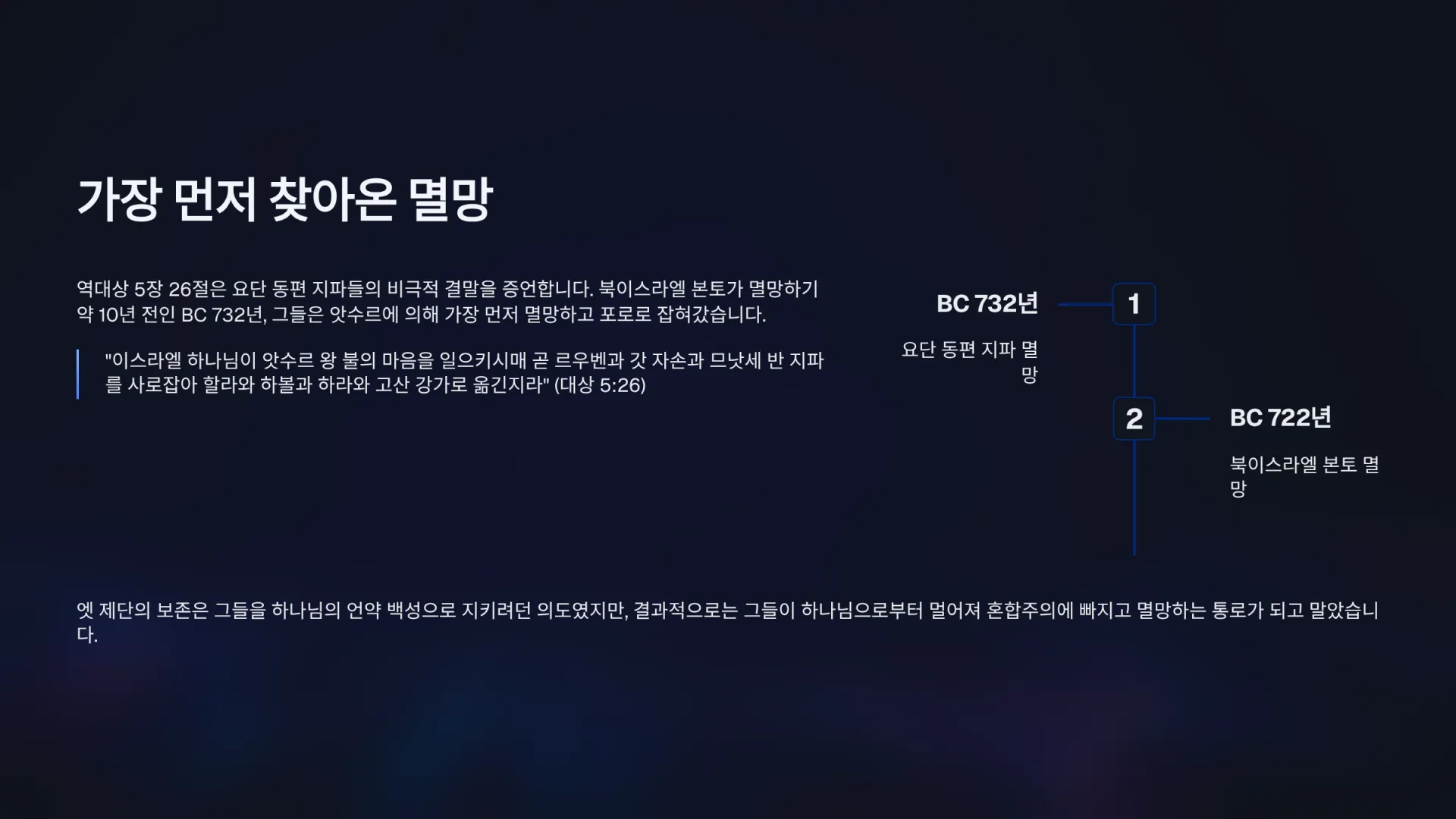 결국 어떻게 되었는가? 요단 동편 지파들은 그들의 혼합주의 신앙과 영적 소외로 인해 가장 먼저 이방 민족에게 멸망을 당하는 비극적인 운명을 맞이하게 된다. 역대상 5장 26절은 “그러므로 이스라엘 하나님이 앗수르 왕 불의 마음을 일으키시며 앗수르 왕 디글랏 빌레셀의 마음을 일으키시매 곧 르우벤과 갓 자손과 므낫세 반 지파를 사로잡아 할라와 하볼과 하라와 고산 강가로 옮긴지라 그들이 오늘까지 거기에 있으니라”고 증언하고 있다. 북이스라엘의 본토가 멸망하기 약 10년 전인 BC 732년에, 요단 동편 지파들은 앗수르에 의해 가장 먼저 멸망하고 포로로 잡혀간 것이다. 엣 제단의 보존은 그들을 하나님의 언약 백성으로 지키려던 의도였지만, 결과적으로는 그들이 하나님으로부터 멀어져 혼합주의에 빠지고 멸망하는 통로가 되고 만 것이다.