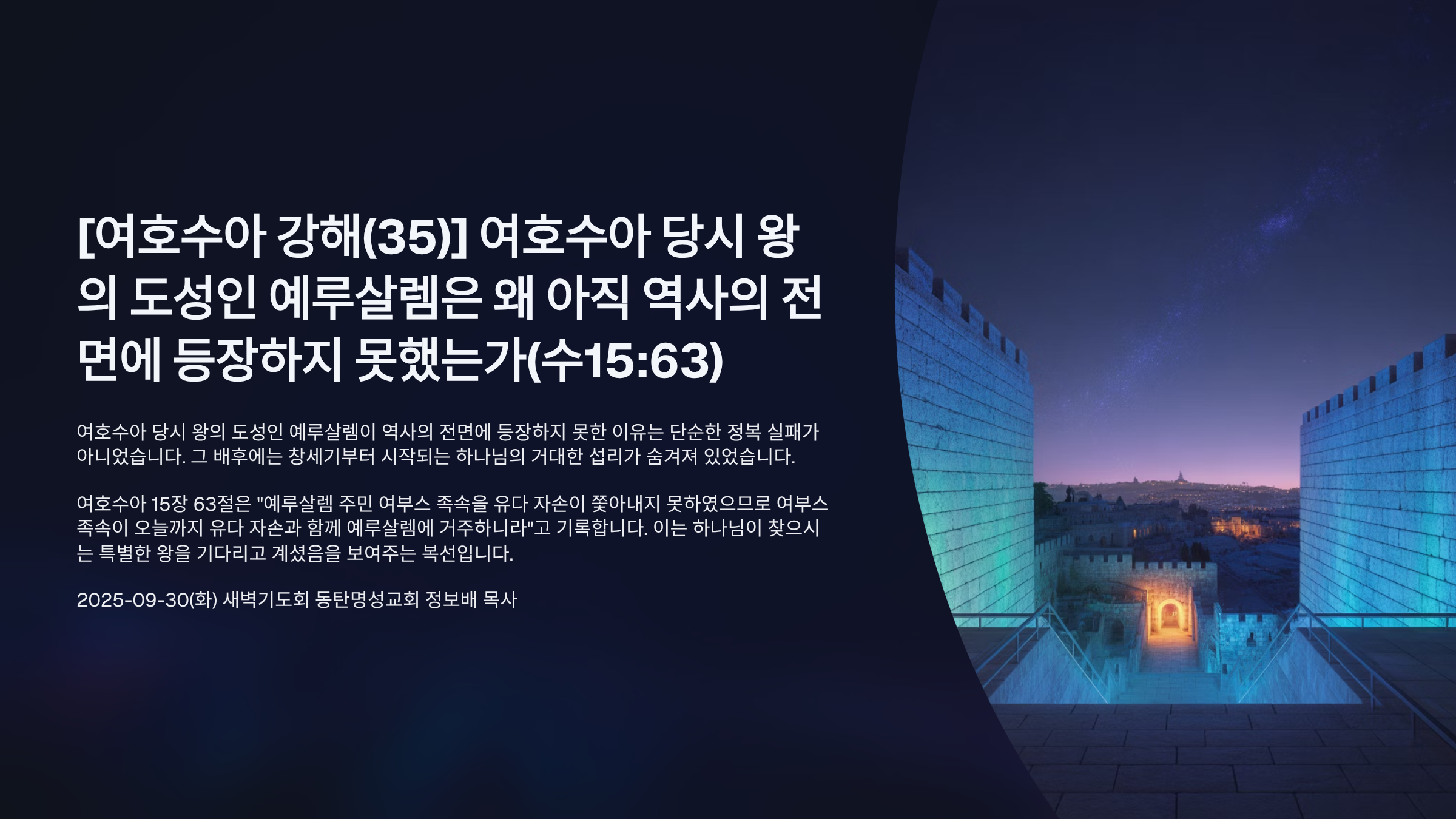 #동탄명성교회 #정보배목사 #새벽기도회 #여호수아강해 #여호수아 #여호수아15장63절 #예루살렘 #왕의도성 #하나님의섭리 #다윗 #멜기세덱 #왕같은제사장 #하나님마음에합한자 #회개 #사랑 #희생 #기업 #새예루살렘