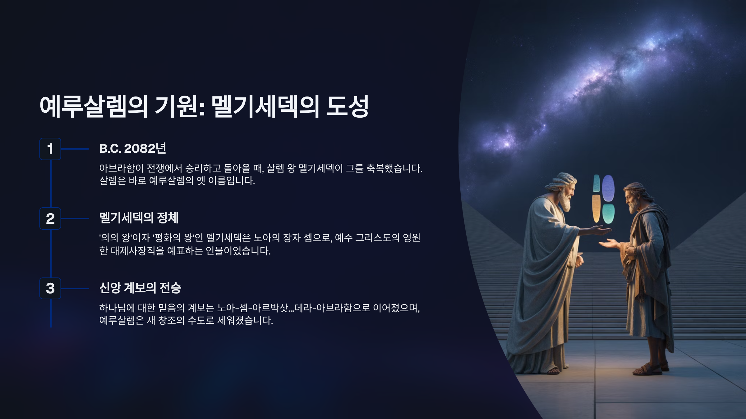 세상에서 가장 위대한 성읍인 저 예루살렘이 역사의 전면에 등장하지 못했던 이유를 이해하기 위해서는, 먼저 이 성이 처음부터 얼마나 특별한 곳이었는지부터 알아야 한다. 이는 예루살렘이 여호수아 시대 때부터 갑자기 중요해진 도시가 아니기 때문이다. 그 기원은 인류 역사의 여명기, 즉 아브라함의 시대(B.C.2106~1931)로 거슬러 올라간다. 왜냐하면 아브라함이 전쟁에서 승리하고 돌아올 때(B.C.2082), 그를 축복했던 인물이 바로 고대 예루살렘이었던 살렘 왕 멜기세덱이었기 때문이다(창 14:19-20).