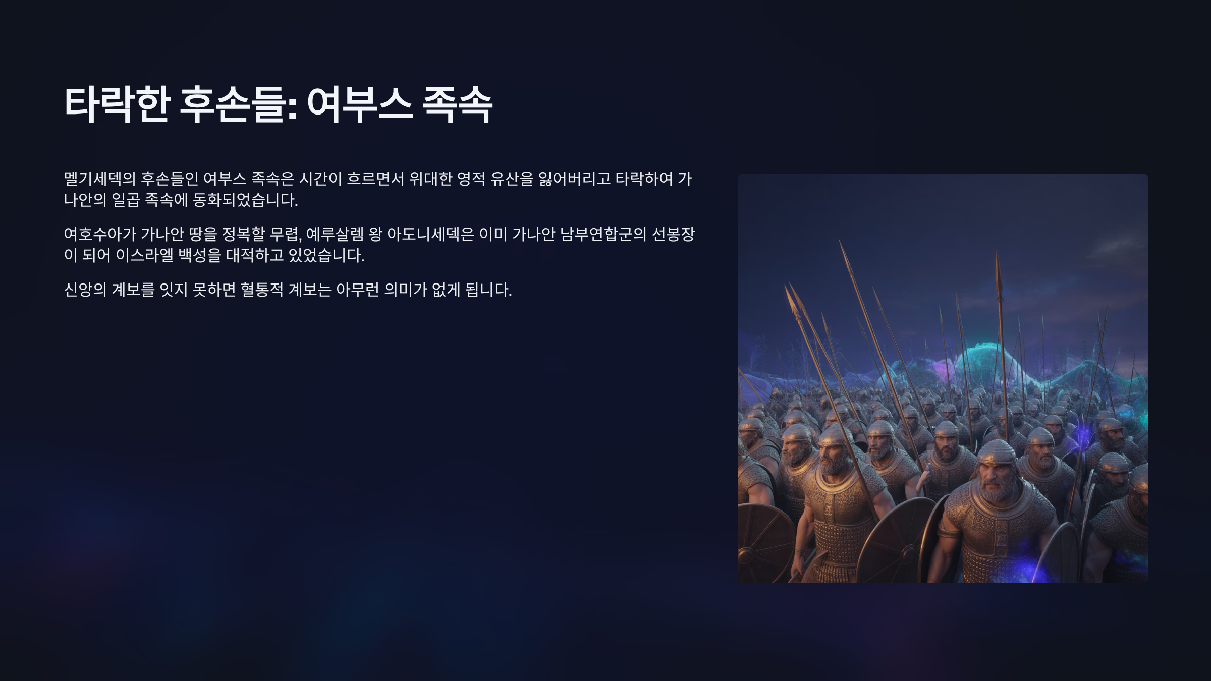 그러나 멜기세덱의 후손들, 즉 여부스 족속은 시간이 흐르면서 이 위대한 영적 유산을 잃어버리고 타락하여 가나안의 일곱 족속에 동화되어 있었다. 그러므로 여호수아가 가나안 땅을 정복할 무렵에 이미 예루살렘 왕은 가나안 일곱 족속의 하나가 되어, 이스라엘 백성을 대적하는 가나안 남부연합군의 선봉장이 되어 있었다(수 10:1-5). 이때 예루살렘 왕 아도니세덱(의의 왕)은 헤브론 왕과 야르뭇 왕과 라기스 왕 그리고 에글론 왕과 더불어 이스라엘과 싸우는 적의 대장이 되어 있었던 것이다. 그랬다. 셈이 죽고 그의 아들 엘람을 통하여 이어진 혈통의 계보는 어느새 그들의 정체성을 잃어버렸고, 오히려 하나님의 백성인 이스라엘을 대적하는 자가 되어 버린 것이다. 이처럼 신앙의 계보를 잇지 못하면, 혈통적 계보는 아무런 의미가 없게 된다.