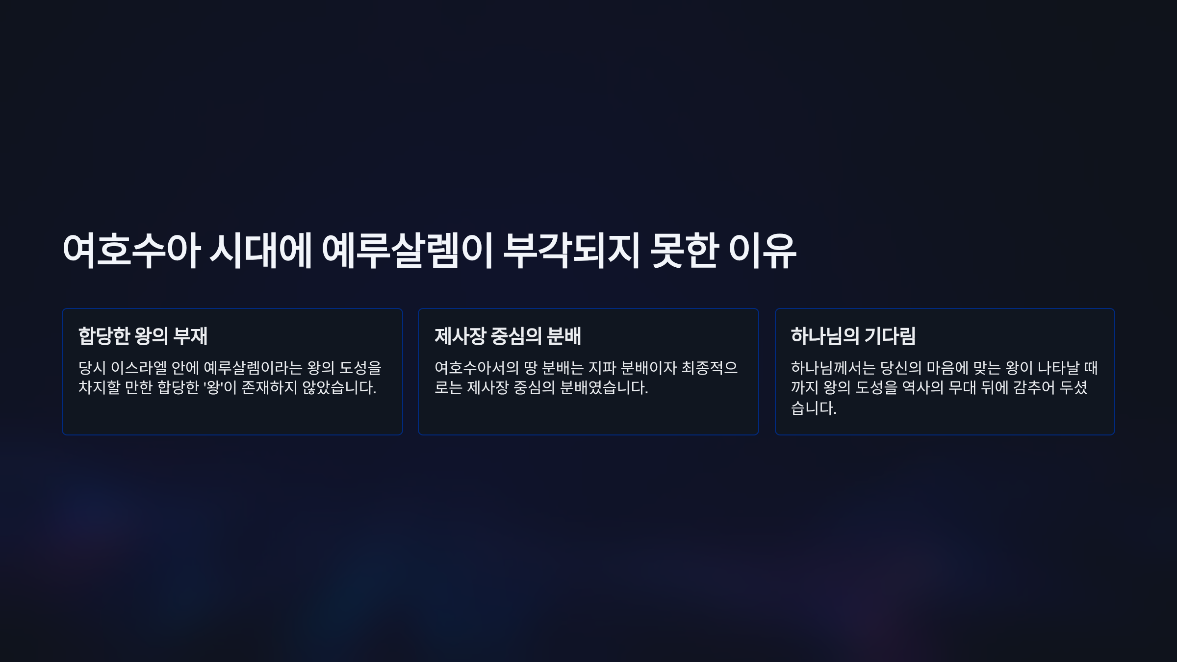 오늘 우리는 예루살렘이 여호수아 시대에 역사의 전면에 등장하지 않은 이유를 통해 하나님의 깊은 섭리와 천국 기업의 조건을 살펴보았다. 하나님께서는 가장 중요한 영원한 도성을, 가장 주님을 사랑하고 가장 자신을 희생할 줄 아는 왕에게 맡기셨다. 그분은 백성을 사랑하여 자신의 죄를 철저히 회개하고 그들을 살리려 했던 다윗과 같은 왕을 지금도 찾고 계신다.