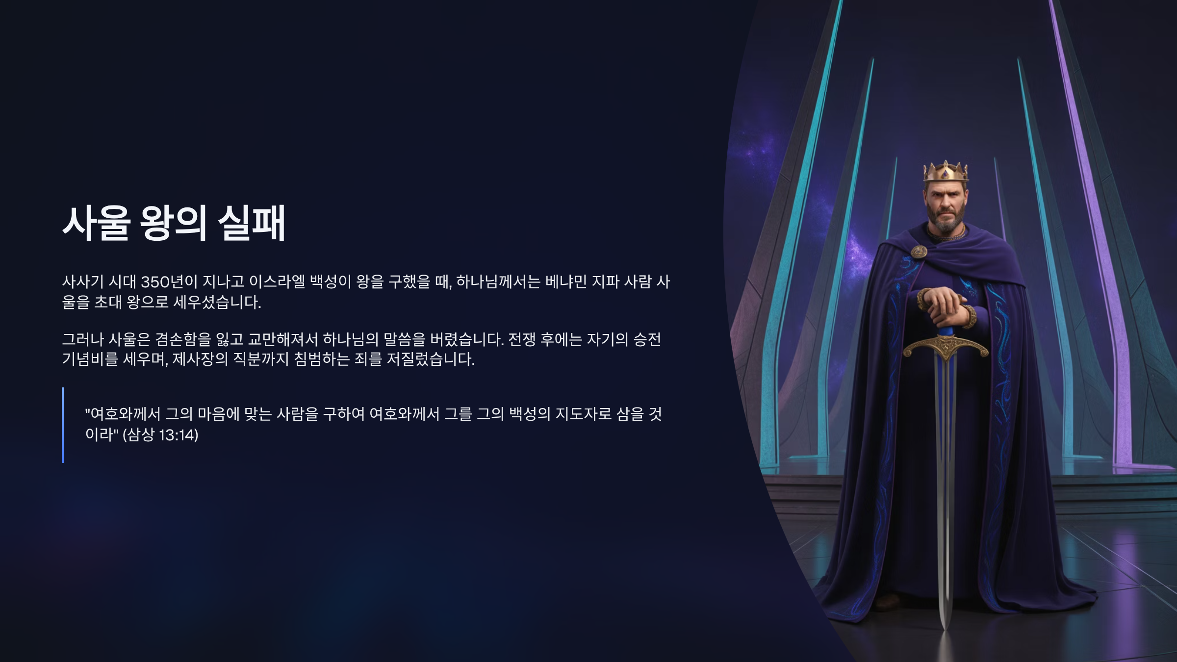 그리고 다시 시간이 흘러 사사기 시대 350년이 지나고 나자 이스라엘 백성도 왕을 구했다. 그러자 하나님께서는 예루살렘을 분배받았던 베냐민 지파 사람에서 이스라엘의 초대 왕 사울을 세우셨다. 그러나 사울은 겸손함을 잃고 교만해져서 하나님의 말씀을 버렸다. 그리고 전쟁 후에는 자기의 승전 기념비를 세우며, 제사장의 직분까지 침범하는 죄를 저질렀다. 그러자 하나님께서는 하나님 마음에 합하지 않는 그를 버리셨다. 왜냐하면 그가 비록 전쟁에 능한 사람이었다고 할지라도 그는 왕의 도성인 예루살렘에 입성할 합당한 사람이 아니었기 때문이다. 그러자 하나님께서는 사무엘 선지자를 시켜서 그의 나라가 길지 못할 것이며, “여호와께서 그의 마음에 맞는 사람을 구하여 여호와께서 그를 그의 백성의 지도자로 삼을” 것(삼상 13:14)이라고 선언하셨다.
