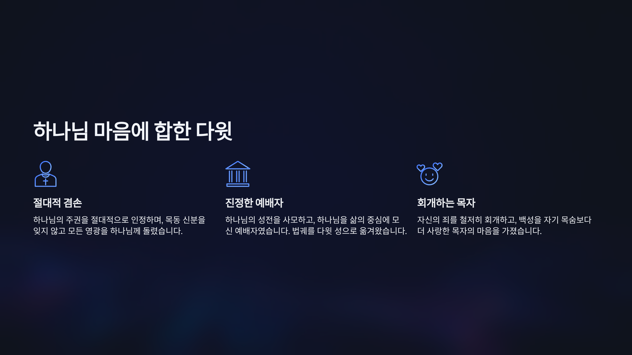 첫째, 그는 하나님의 주권을 절대적으로 인정하는 겸손한 사람이었다. 그는 비록 첩의 자식으로 태어나 아버지에게조차 인정받지 못하고 들판에서 양을 치는 목동으로 자랐만, 그 자리에서 수금을 타며 “여호와는 나의 목자시니 내게 부족함이 없으리로다”라고 노래하며 하나님만을 의지했다. 그는 왕이 된 후에도 자신의 원래 신분이 목동이었음을 잊지 않았고, 모든 영광을 하나님께 돌렸다.