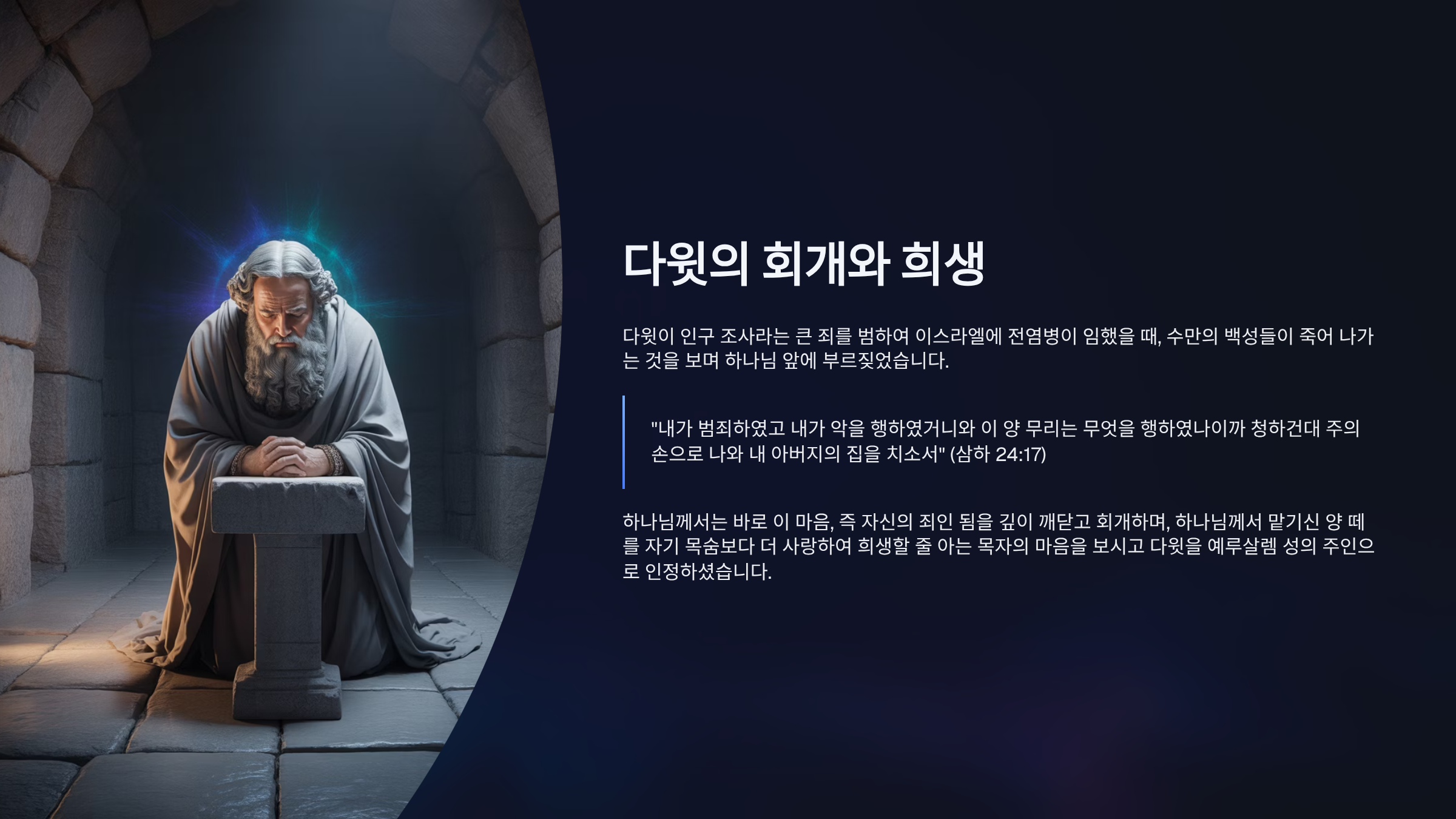 셋째, 그는 자신의 죄를 철저히 회개하고, 백성을 자기 목숨보다 더 사랑한 목자였다(삼하 24:10, 17). 그는 인구 조사라는 큰 죄를 범하여 이스라엘에 전염병이 임했을 때, 수 만의 백성들이 죽어 나가는 것을 보며 하나님 앞에 이렇게 부르짖었다.