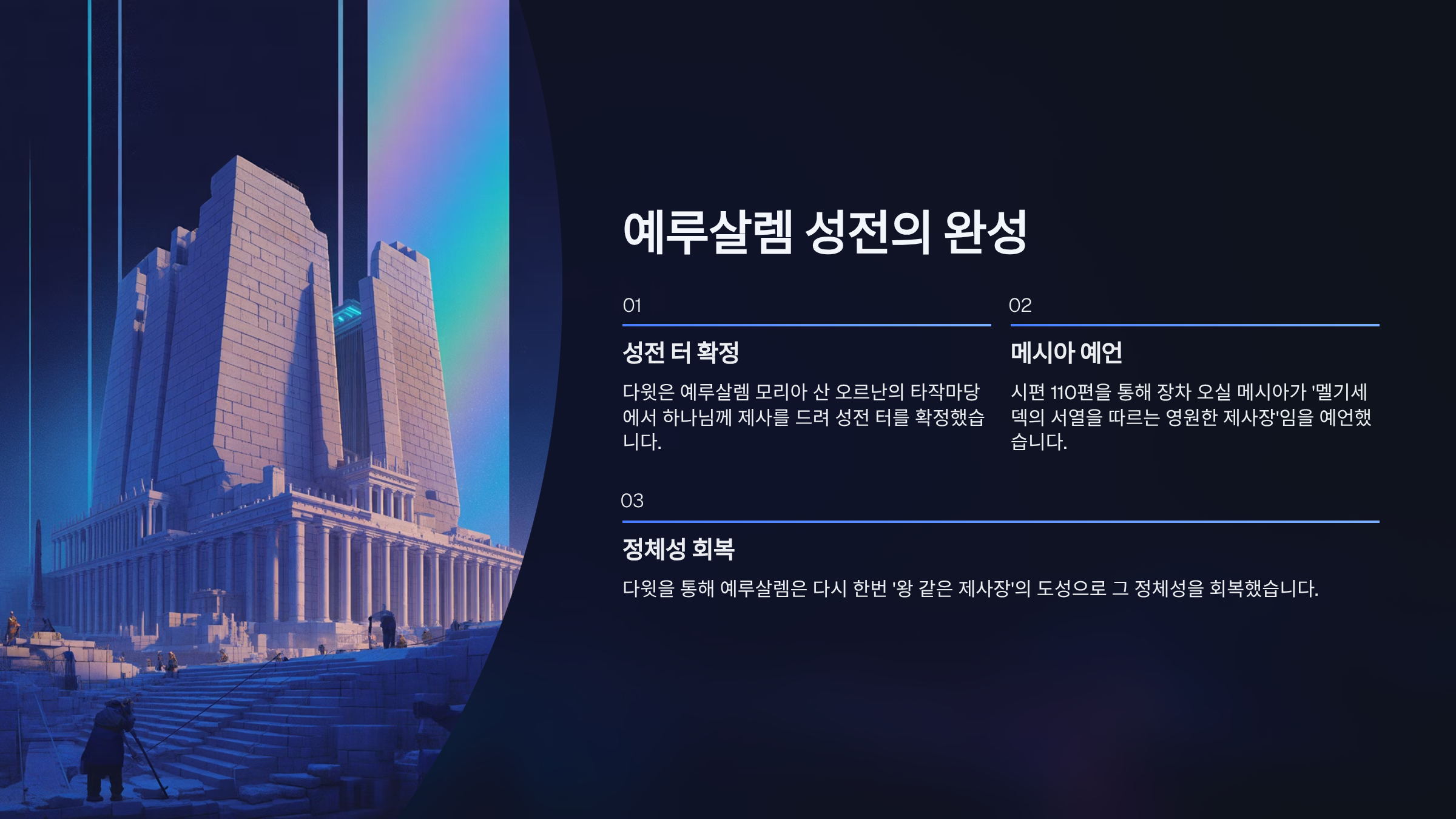 이처럼 다윗을 통해 예루살렘은 다시 한번 ‘왕 같은 제사장’의 도성으로 그 정체성을 회복하게 되었다. 그리고 이 예루살렘은 장차 하늘에 세워질 새 예루살렘 성의 모형이 되었다. 요한계시록은 천년왕국 때 성도들이 하나님과 그리스도의 제사장이 되어 왕 노릇 할 것이며(계 20:6), 새 하늘과 새 땅에서는 세세토록 왕 노릇 할 것(계 22:5)이라고 약속한다.