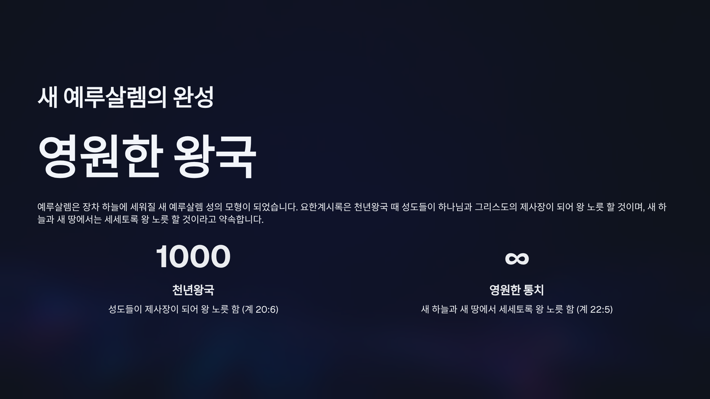결국, 구원의 궁극적인 완성은 ‘왕’의 신분으로 귀결되는 것이다. 하나님께서는 다윗처럼 자신의 죄를 철저히 회개하고, 백성을 자신의 목숨보다 더 사랑하며 희생할 줄 아는 자에게 가장 귀한 기업인 예루살렘을 주셨으며, 그에게 ‘왕’이라는 최고의 영광스러운 신분을 허락하셨다.