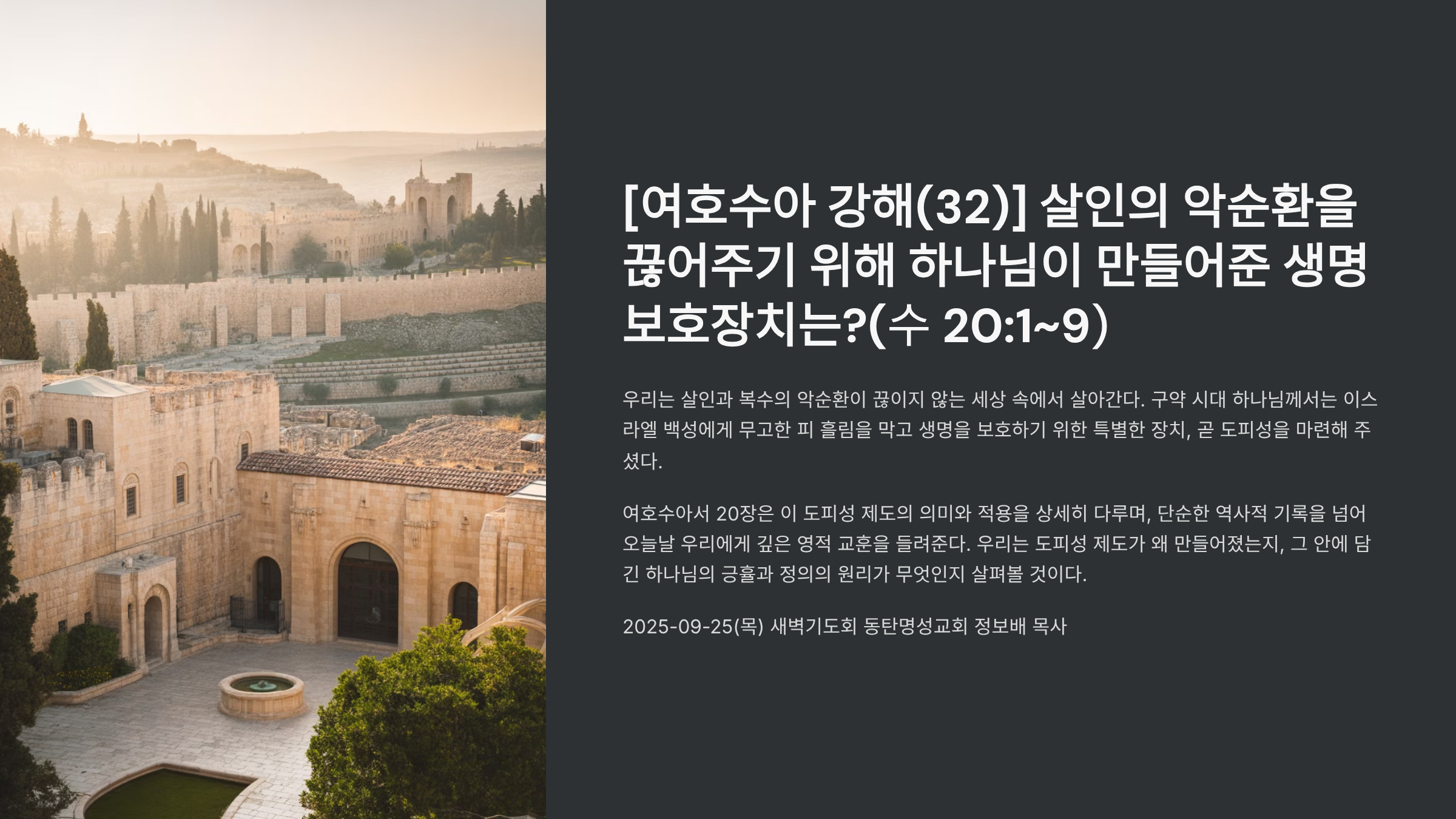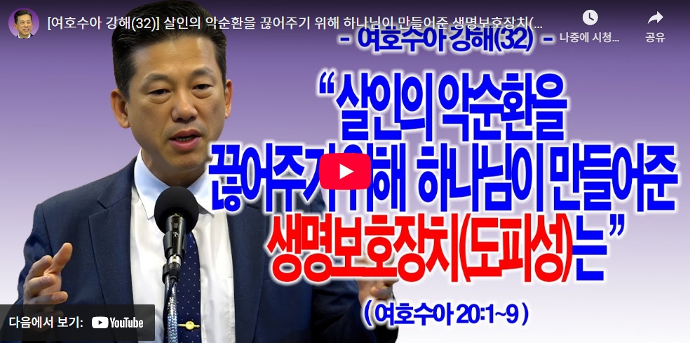 제목: [여호수아 강해(32)] 살인의 악순환을 끊어주기 위해 하나님이 만들어준 생명보호장치는?(수20:1~9)_2025-09-25(목) https://youtu.be/YnGKHpEkRRs