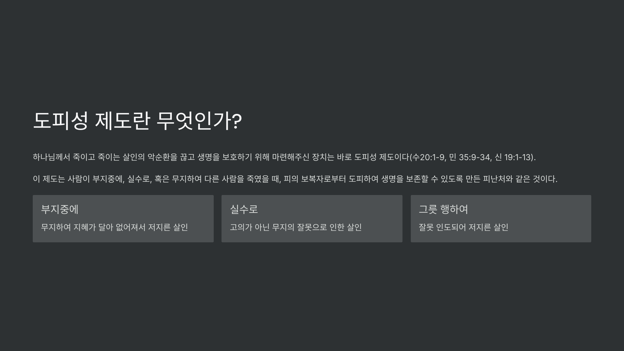 하나님께서 죽이고 죽이는 살인의 악순환을 끊고 생명을 보호하기 위해 마련해주신 장치는 무엇인가? 그것은 바로 도피성 제도이다(수20:1~9, 민 35:9~34, 신 19:1~13). 이 제도는 사람이 부지중에, 실수로, 혹은 무지하여 다른 사람을 죽였을 때, 피의 보복자로부터 도피하여 생명을 보존할 수 있도록 만든 피난처와 같은 것이다.
