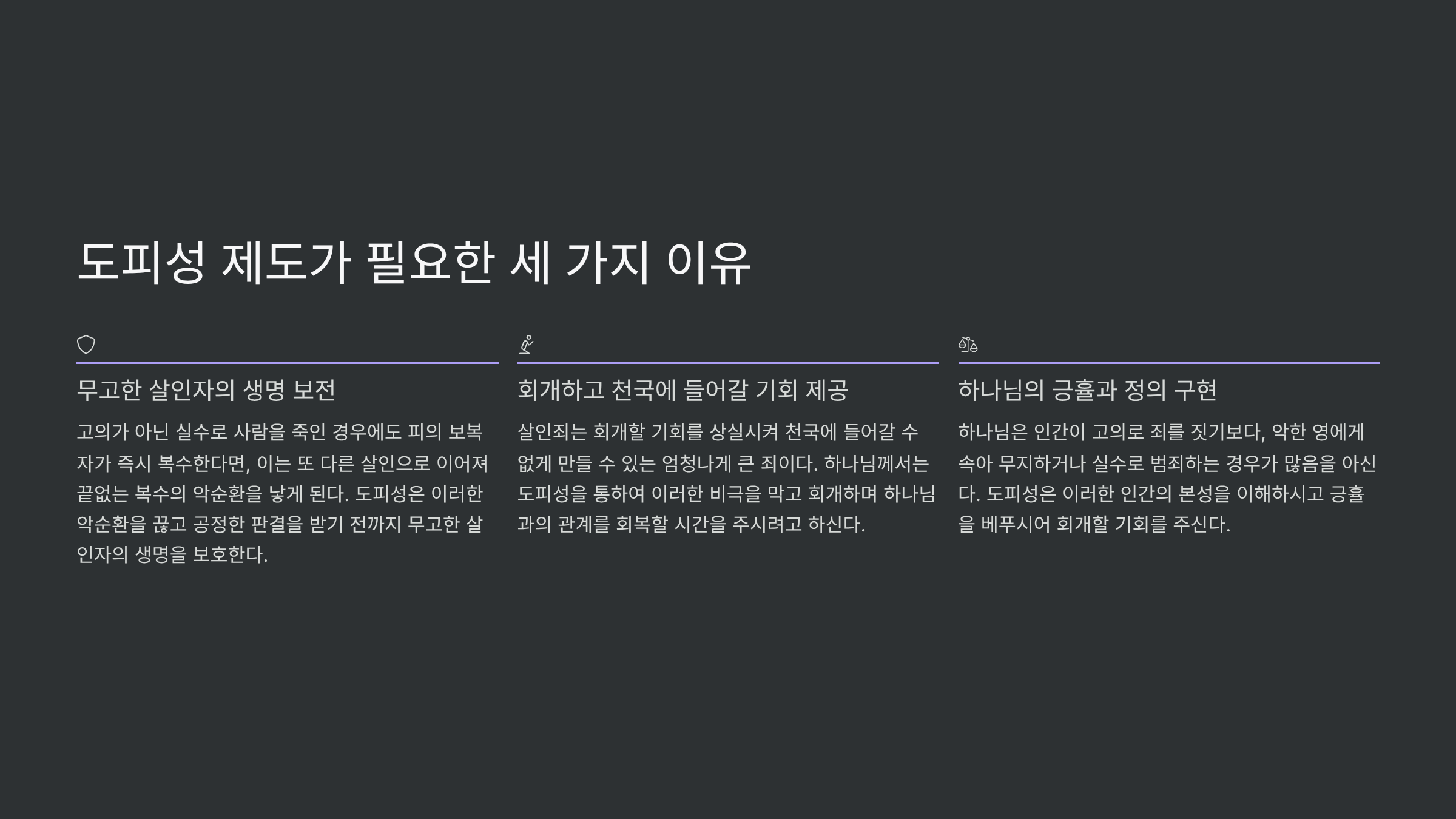 셋째, 하나님의 긍휼과 정의를 구현하기 위함이다. 하나님은 인간이 고의로 죄를 짓기보다, 악한 영에게 속아 무지하거나 실수로 범죄하는 경우가 많음을 아신다. 하와가 뱀에게 속아 선악과를 따먹고, 아담이 하와를 사랑하여 범죄했듯이, 인간은 대부분 고의가 아닌 연약함 때문에 죄를 짓는다. 그러므로 도피성은 이러한 인간의 본성을 이해하시고 긍휼을 베푸시어, 회개할 기회를 주심으로써 하나님의 정의가 온전히 구현되도록 돕는 것이다.