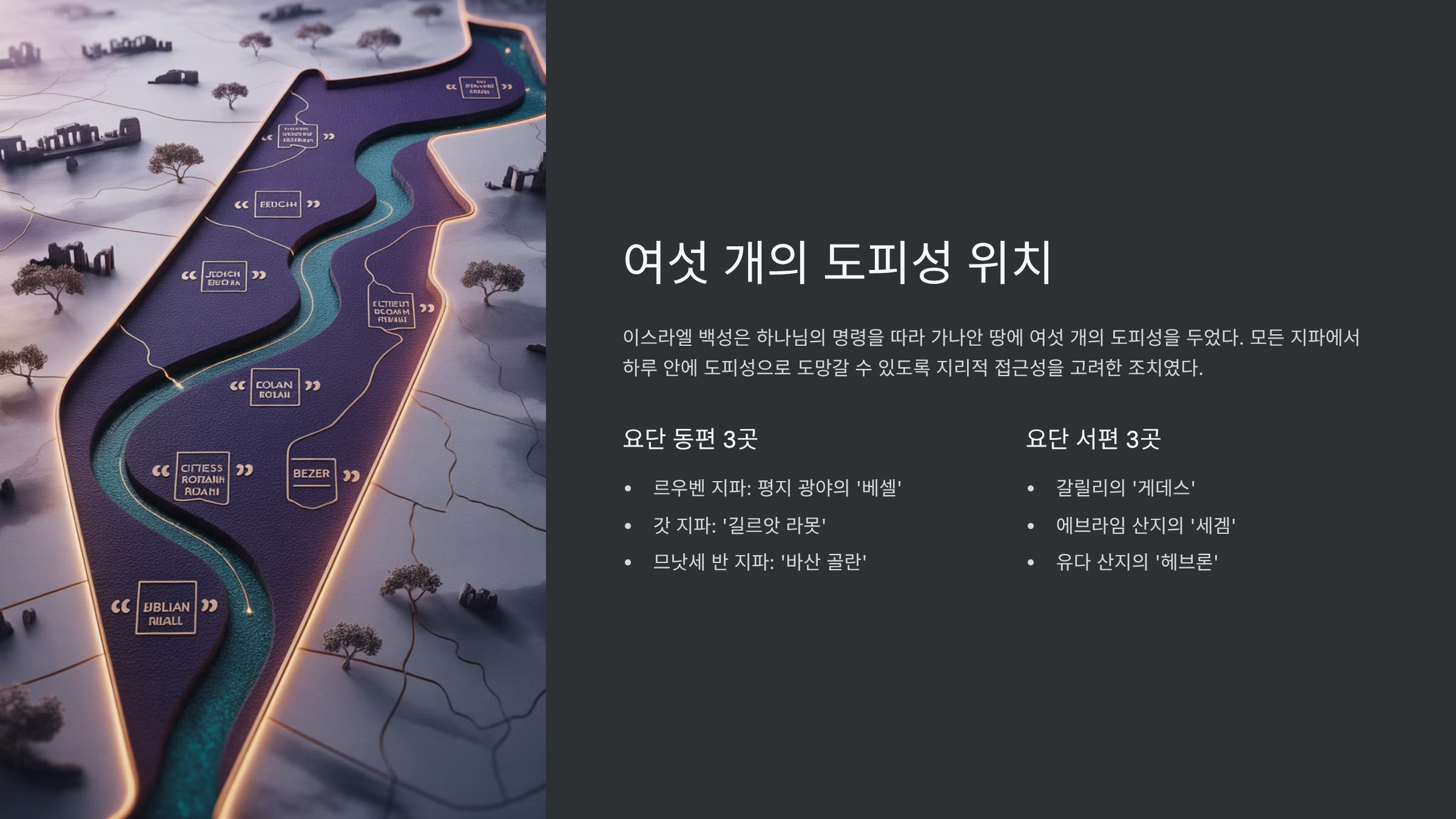 그래서 도피성은 실수로 살인한 자가 피의 보복자로부터 피하여 생명을 보존하는 역할을 수행한다. 이스라엘 백성은 하나님의 명령을 따라서 가나안 땅에 여섯 개의 도피성을 두었는데, 요단 동편에 세 곳(르우벤 지파 중에서 평지 광야의 '베셀', 갓 지파 중에서 '길르앗 라못', 므낫세 반 지파 중에서 '바산 골란'), 요단 서편에 세 곳(갈릴리의 '게데스', 에브라임 산지의 '세겜', 유다 산지의 '헤브론')을 지정하여 모든 지파에서 하루 안에 도피성으로 도망갈 수 있도록 하였다(수 20:7-8). 이는 지리적 접근성을 고려한 조치였다. 왜냐하면 요단강 동편에 위치한 세 개의 도피성들과 요단강 서편에 위치한 세 개의 도피성들은 다 이스라엘이 분배받은 땅의 위쪽과 중간과 아래쪽의 각각 중간쯤에 위치해 있기 때문이다.