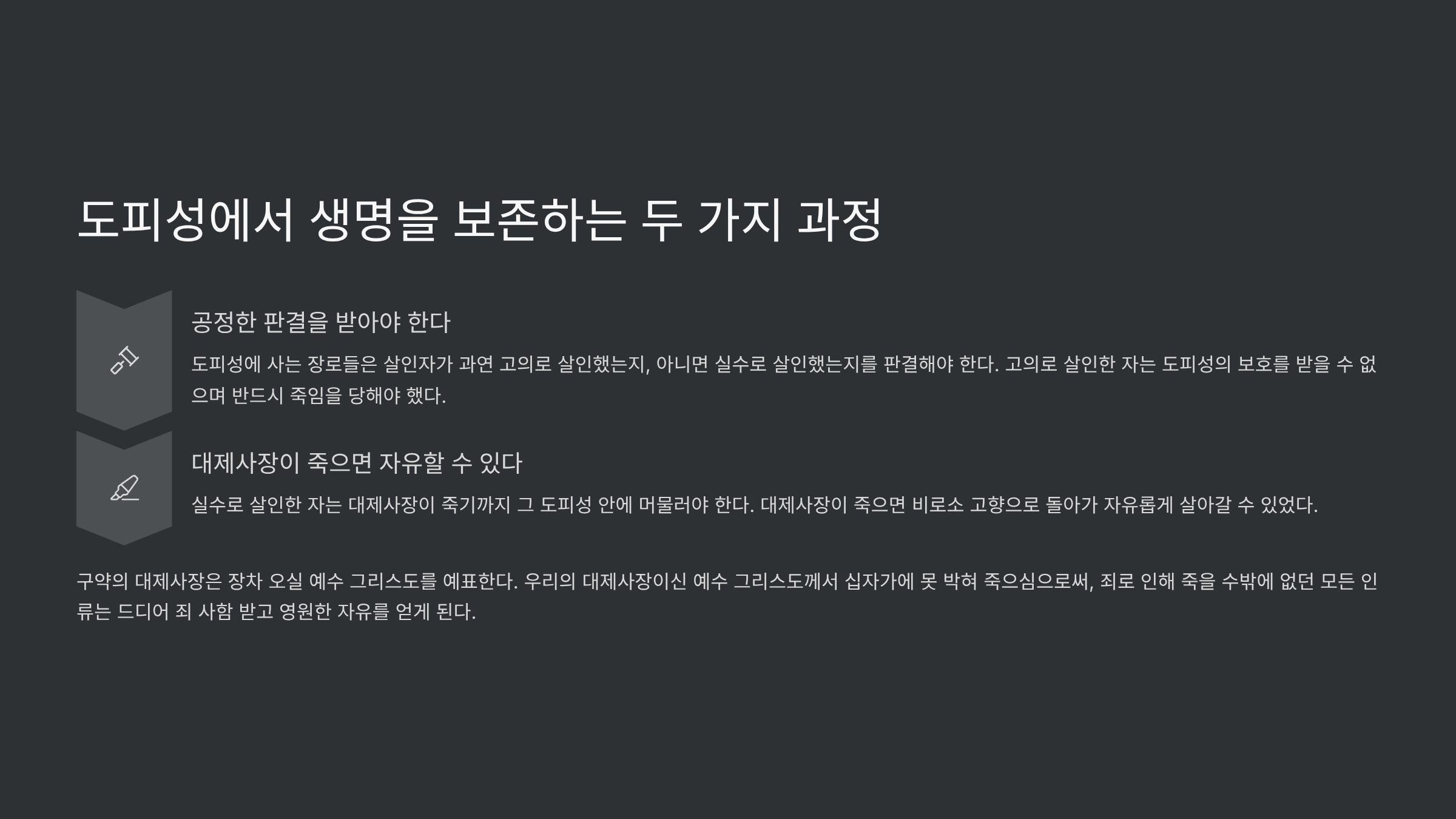 둘째, 대제사장이 죽으면 자유할 수 있다고 하였다(수 20:6). 실수로 살인한 자는 대제사장이 죽기까지 그 도피성 안에 머물러야 한다. 그런데 만약 대제사장이 죽으면 그는 비로소 고향으로 돌아가 자유롭게 살아갈 수 있었다. 그런데 사실 이러한 사실은 매우 중요한 영적 의미를 지닌다. 구약의 대제사장은 장차 오실 예수 그리스도를 예표하기 때문이다(히 3:1). 우리의 대제사장이신 예수 그리스도께서 십자가에 못 박혀 죽으심으로써, 죄로 인해 죽을 수밖에 없던 모든 인류는 그분에게 임시로 피해 있다가 드디어 죄 사함 받고 영원한 자유를 얻게 되기 때문이다. 즉, 예수 그리스도 자신이 우리 인류의 궁극적인 도피처가 되시며, 그분의 죽음은 우리에게 완전한 죄 사함과 해방을 가져다주는 것이다.