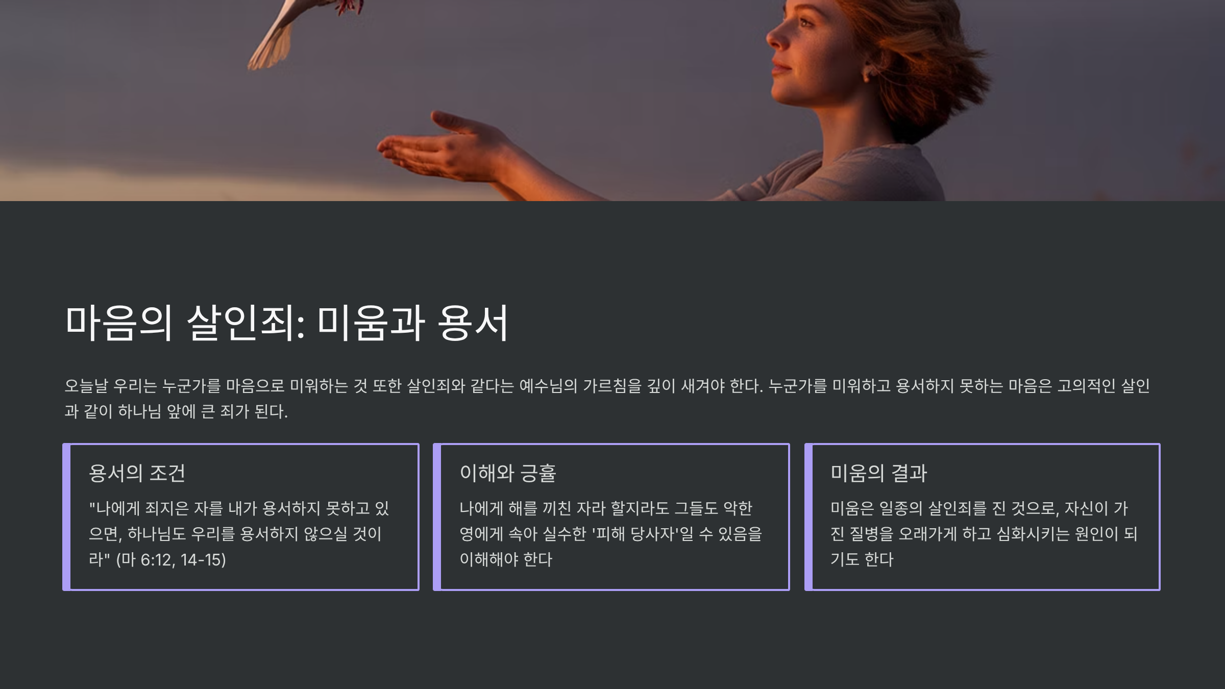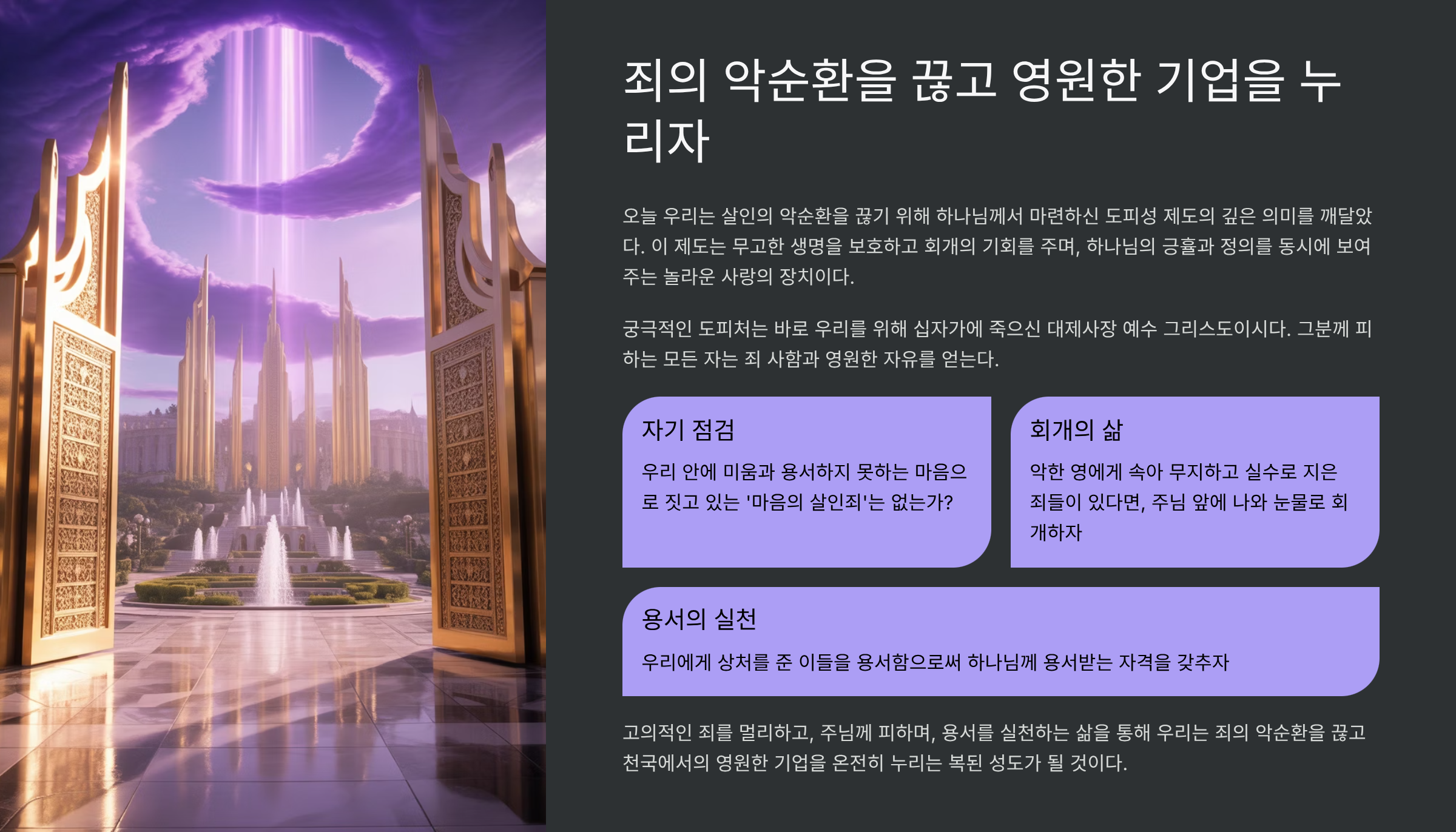 오늘 우리는 살인의 악순환을 끊기 위해 하나님께서 마련하신 도피성 제도의 깊은 의미를 깨닫는다. 이 제도는 무고한 생명을 보호하고 회개의 기회를 주며, 하나님의 긍휼과 정의를 동시에 보여주는 놀라운 사랑의 장치이다. 궁극적인 도피처는 바로 우리를 위해 십자가에 죽으신 대제사장 예수 그리스도이시다. 그분께 피하는 모든 자는 죄 사함과 영원한 자유를 얻는다. 이제 우리는 이 진리를 바탕으로 우리의 삶을 돌아봐야 한다. 우리 안에 미움과 용서하지 못하는 마음으로 짓고 있는 '마음의 살인죄'는 없는가? 혹시 악한 영에게 속아 무지하고 실수로 지은 죄들이 있다면, 주님 앞에 나와 눈물로 회개해야 한다. 또한, 우리에게 상처를 준 이들을 용서함으로써 하나님께 용서받는 자격을 갖추어야 한다. 고의적인 죄를 멀리하고, 주님께 피하며, 용서를 실천하는 삶을 통해 우리는 죄의 악순환을 끊고 천국에서의 영원한 기업을 온전히 누리는 복된 성도가 될 것이다.