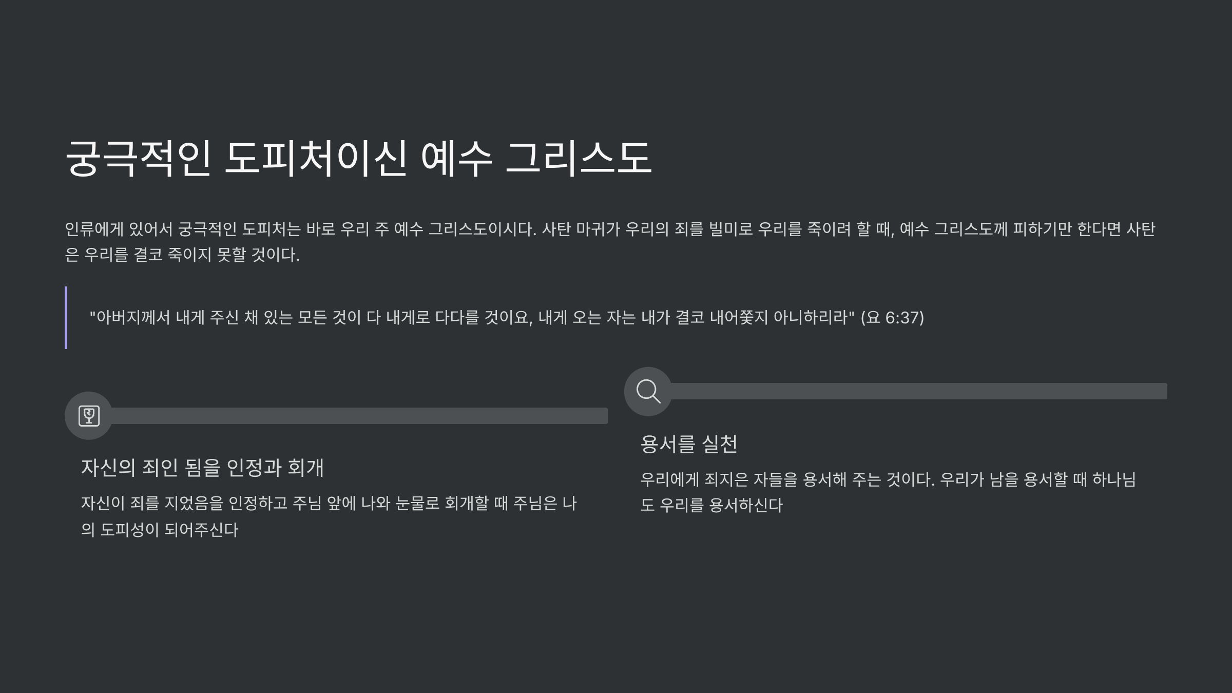 고로 인류에게 있어서 궁극적인 도피처는 바로 우리 주 예수 그리스도이시다(마 11:29-30). 사탄 마귀가 우리의 죄를 빌미로 우리를 죽이려 할 때, 예수 그리스도께 피하기만 한다면 사탄은 우리를 결코 죽이지 못할 것이다. 요한복음 6장 37절을 보라. "아버지께서 내게 주신 채 있는 모든 것이 다 내게로 다다를 것이요, 내게 오는 자는 내가 결코 내어쫓지 아니하리라"(헬라어 직역)고 말씀하고 있다. 이는 누구든지 예수님께 피하는 모든 자를 그분이 보호해 주시겠다는 약속이다.
