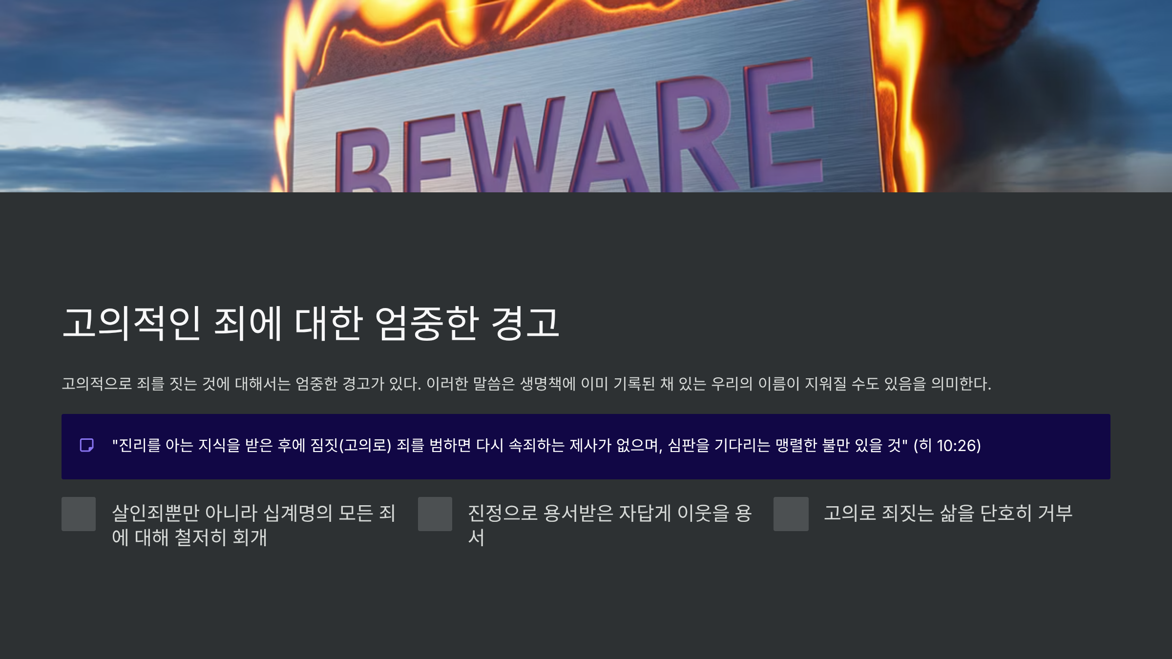 하지만 고의적으로 죄를 짓는 것에 대해서는 엄중한 경고가 있다. "진리를 아는 지식을 받은 후에 짐짓(고의로) 죄를 범하면 다시 속죄하는 제사가 없으며, 심판을 기다리는 맹렬한 불만 있을 것" 히브리서는 경고하고 있다(히 10:26). 이러한 말씀은 생명책에 이미 기록된 채 있는 우리의 이름이 지워질 수도 있음을 의미한다. 그러므로 우리는 살인죄뿐만 아니라 십계명의 모든 죄에 대해 철저히 회개하고, 진정으로 용서받은 자답게 이웃을 용서하며, 고의로 죄짓는 삶을 단호히 거부해야 할 것이다.