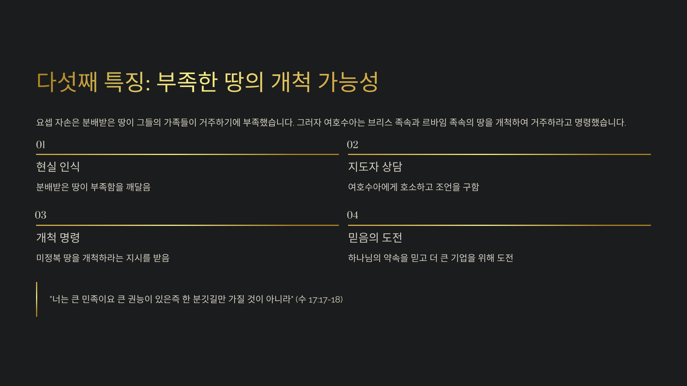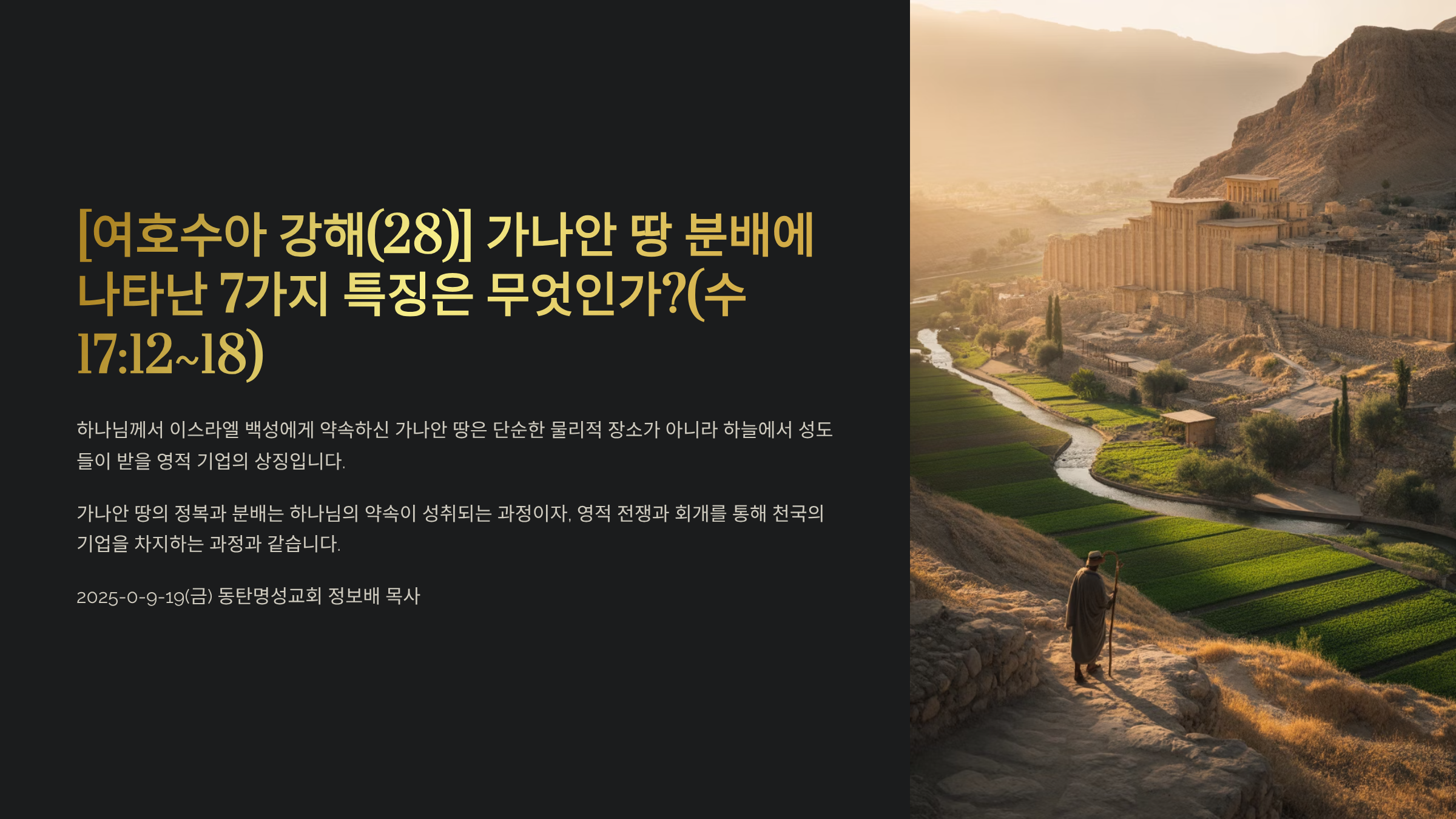 제목: [여호수아 강해(28)] 가나안 땅 분배에 나타난 7가지 특징은 무엇인가?(수17:12~18)_2025-09-19(금)