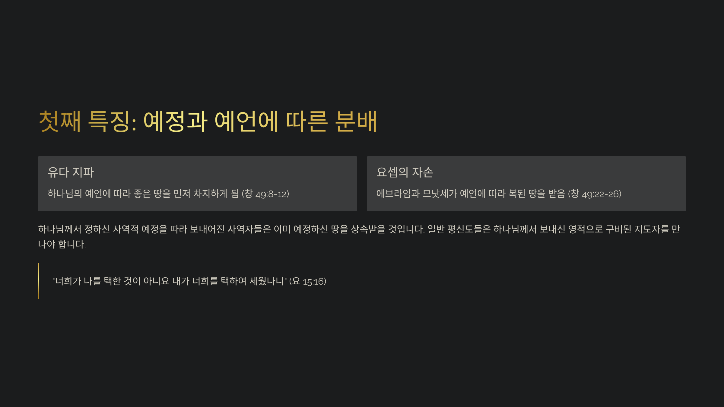 첫째, 가장 우선적인 땅의 분배의 특징은 예정과 예언에 따른 분배였다는 것이다.