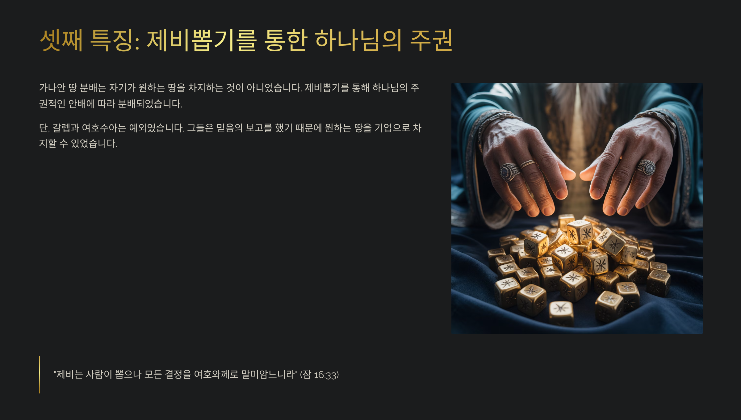 셋째, 어느 지역에 땅을 차지하게 될른는지는 제비뽑기를 함으로 하나님의 주권에 따라 결정되었다는 것이다.