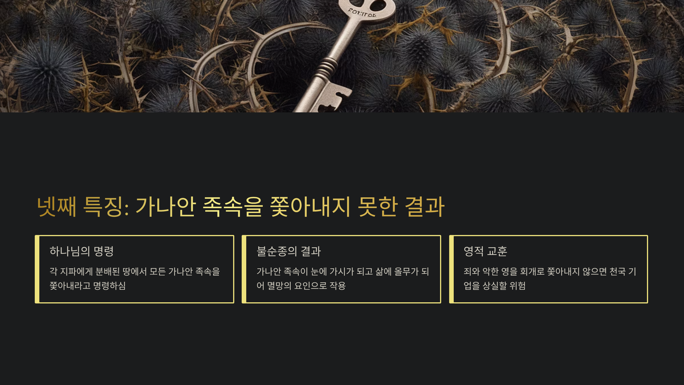 넷째, 하나님이 주신 땅이지만 그곳에 있는 가나안 족속을 쫓아내지 못했을 때에는 그것이 긴 아픔으로 작용했다는 것이다.