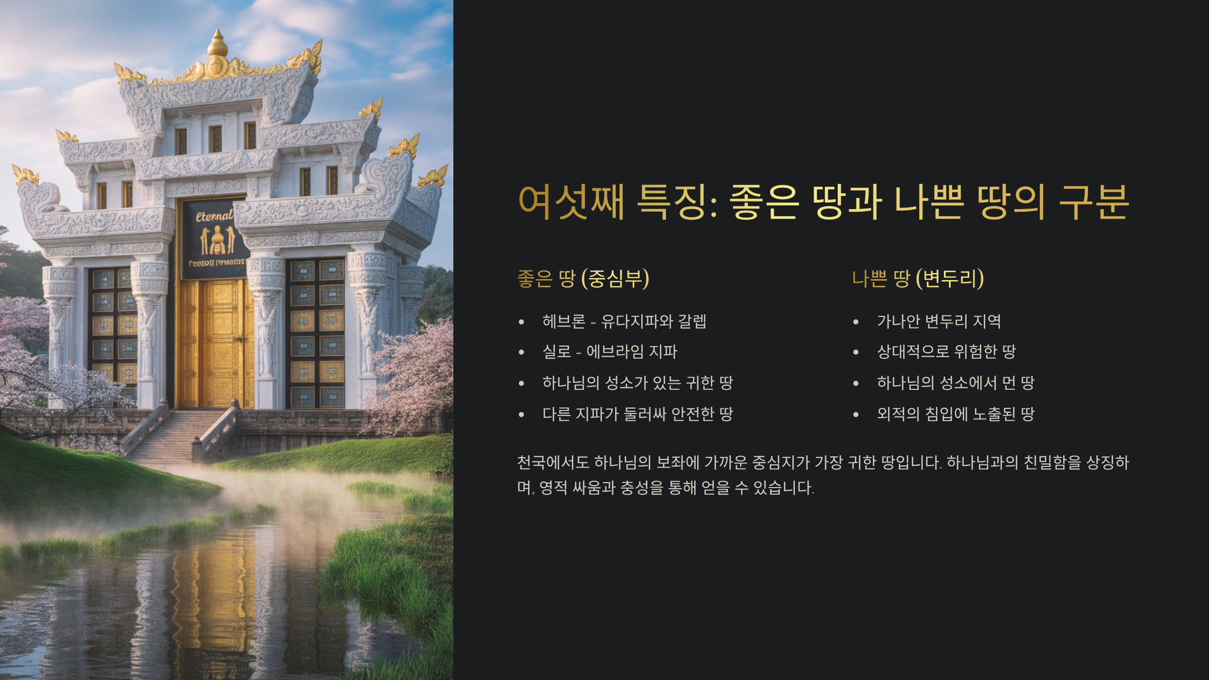 여섯째, 가나안 땅에도 좋은 땅과 나쁜 땅이 있었다는 것이다. 가나안 땅에는 좋은 땅과 나쁜 땅이 있었다. 가나안 중심부에 있는 땅이 좋은 땅이요 변두리에 있는 땅은 나쁜 땅이라고 할 수 있다. 왜냐하면 헤브론과 실로와 같은 중심지는 하나님의 성소가 있는 귀한 땅이자 안전한 땅이었기 때문이다. 즉 헤브론은 유다지파와 갈렙이 받은 땅으로서 위와 같은 땅이었고, 실로는 에브라임 지파가 받은 땅으로서 위와 같은 땅이었기 때문이다. 특히 가나안 중심부의 땅들은 다른 지파가 주변을 두르고 있어 비교적 안전한 땅이었다. 이렇듯 천국에서도 하나님의 보좌에 가까운 중심지가 가장 귀한 땅이라고 할 수 있다(시 16:11). 고로 우리 그리스도인들은 회개와 순종을 통해 보다 더 하나님 보좌에 가까운 좋은 땅을 얻기 위해 노력해야 한다. 여기서 하나님의 보좌가 가까운 땅을 차지한다는 것은 하나님과 보다 더 친밀함을 갖게 된다는 것을 상징한다. 그리고 이것은 역시 영적 싸움을 통해 그리소 충성을 통해 얻을 수 있다.