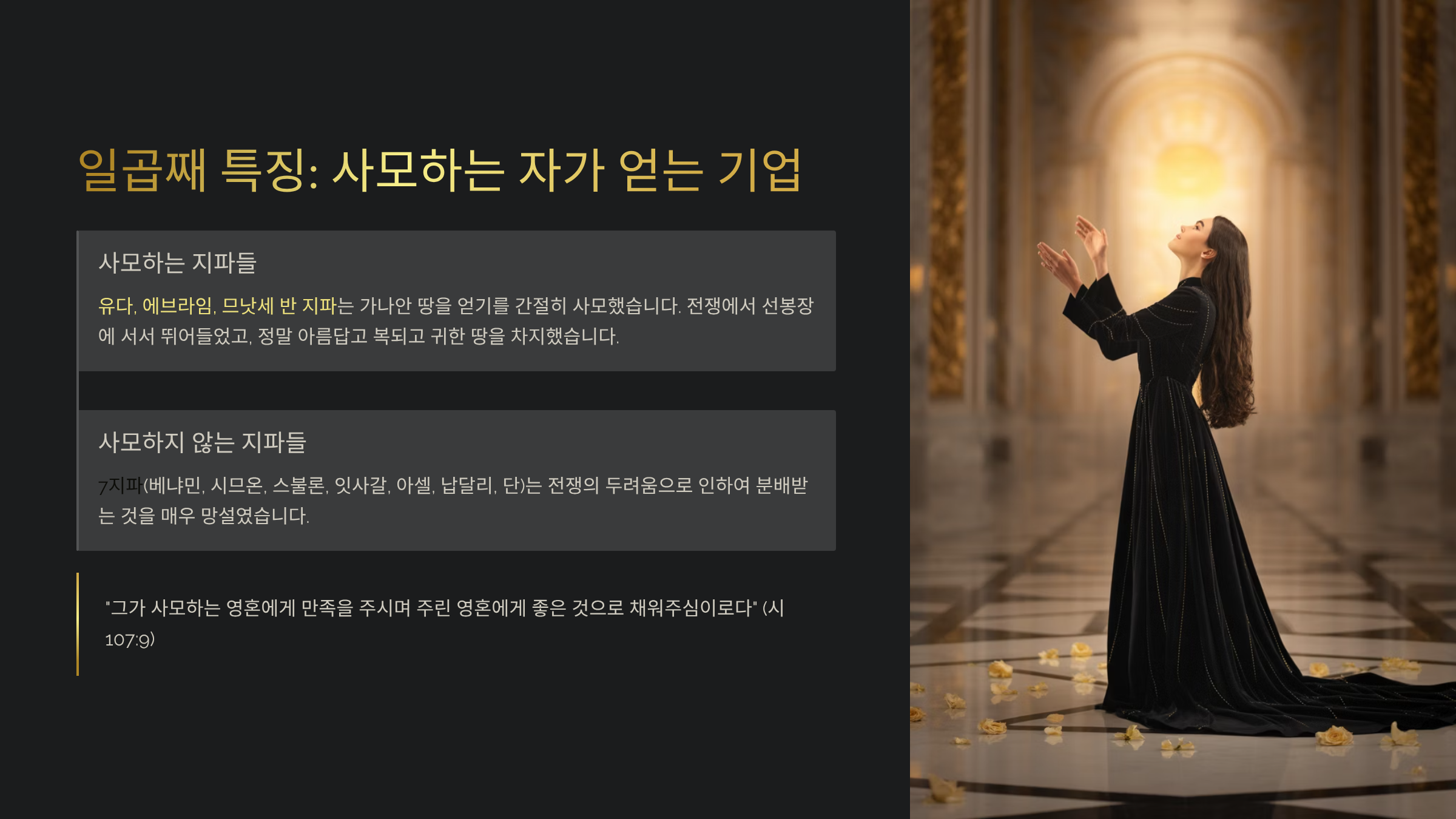 가나안 땅을 얻되, 그 땅을 얻기를 사모하는 지파(유다, 에브라임, 므낫세 반 지파)가 있었고, 반대로 그 땅을 사모하지 않는 지파가 있었다. 사모하지 않는 7지파의 사람들(베냐민 지파, 시므온 지파, 스불론 지파, 잇사갈 지파, 아셀 지파, 납달리 지파, 단 지파)은 전쟁의 두려움으로 인하여 분배받는 것을 매우 망설였다. 그러나 가나안 땅을 기업으로 차지하는 것을 사모했던 2지파 반(유다 지파, 에브라임 지파, 므낫세 반 지파)은 역시 달랐다. 그들은 어서 그 땅을 얻기를 사모하였기에 전쟁에 있어서도 선봉장에 서서 뛰어들었다. 그리고 정말로 그들이 차지하게 된 땅은 정말 아름답고 복되고 귀한 땅이었다. 이는 천국을 소망하지 않고 회개에 관심 없는 그리스도인들은 그 땅을 차지하 못할 수도 있음을 의미한다. 왜냐하면 지금도 하나님께서는 사모하는 자에게 당신의 기업을 나눠 주시며, 도전하는 자에게 무기와 능력까지도 주시어 전쟁을 수행하시게 하기 때문이다. 결국 그리스도인이 되었다고 할지라도 천국의 기업을 사모하는 자만이 그 기업을 차지하게 될 것이며, 하나님의 보좌 가까이에서 살고 하나님의 보좌 가까이에서 예배드리는 영광을 누리게 될 것이다.