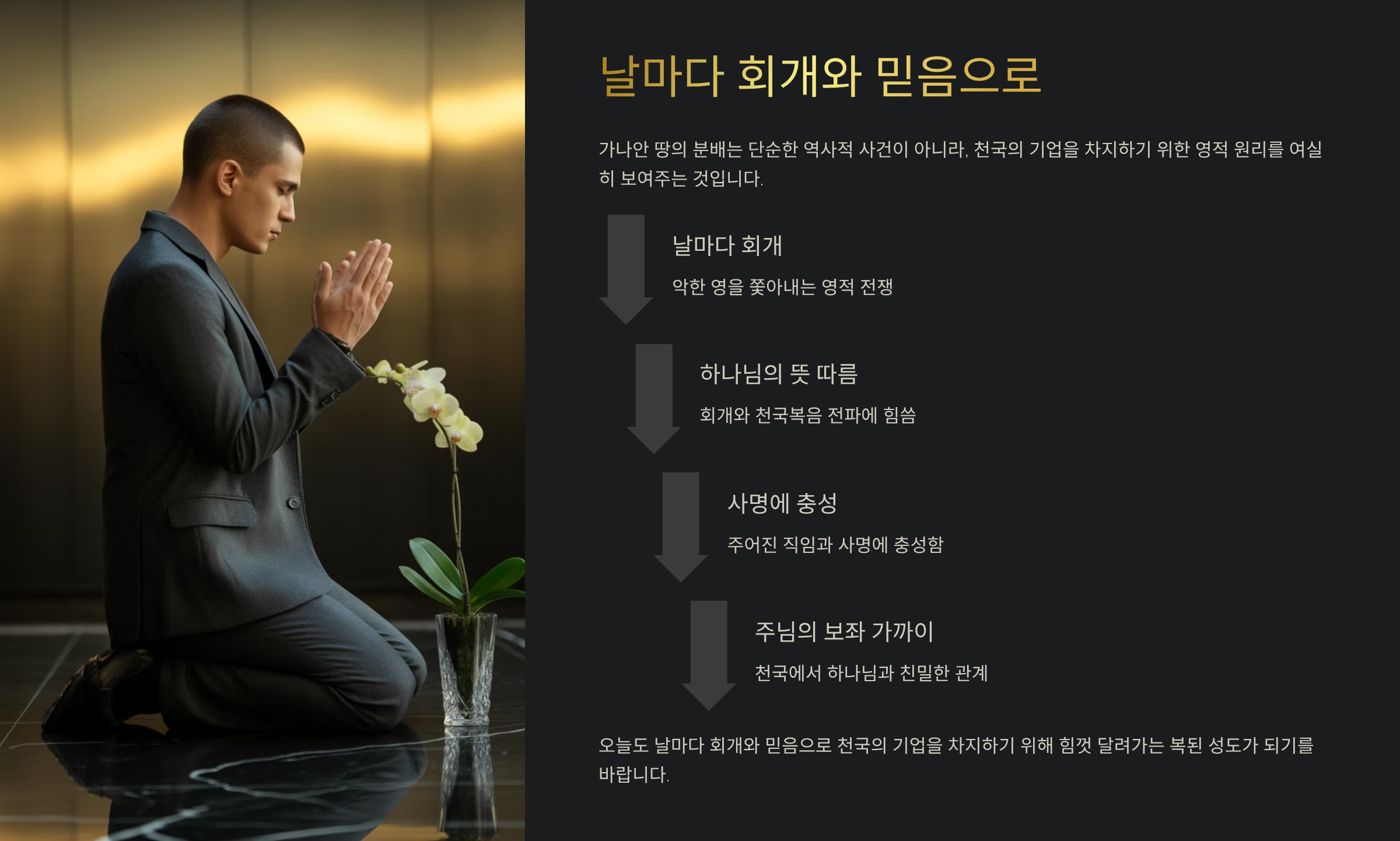 가나안 땅 분배는 하나님의 예정과 예언에 따라 이루어지며, 영적 전쟁과 회개를 통해 얻어진다. 하나님의 주권적 제비뽑기로 분배된 땅은 악한 영을 쫓아내지 않으면 잃을 수 있다. 믿음으로 개척하고 좋은 땅을 사모하는 자가 천국의 큰 기업을 차지할 것이다.