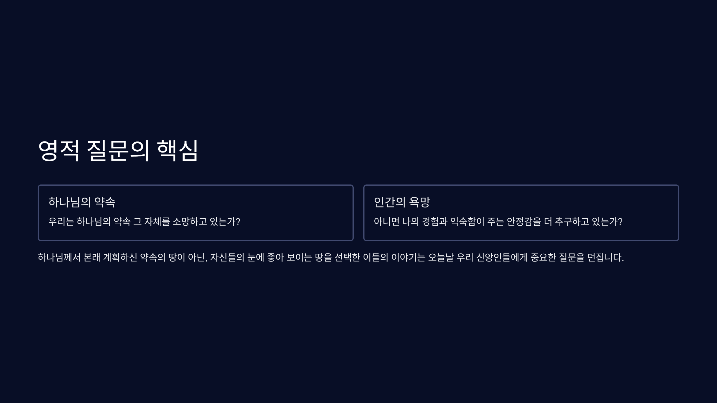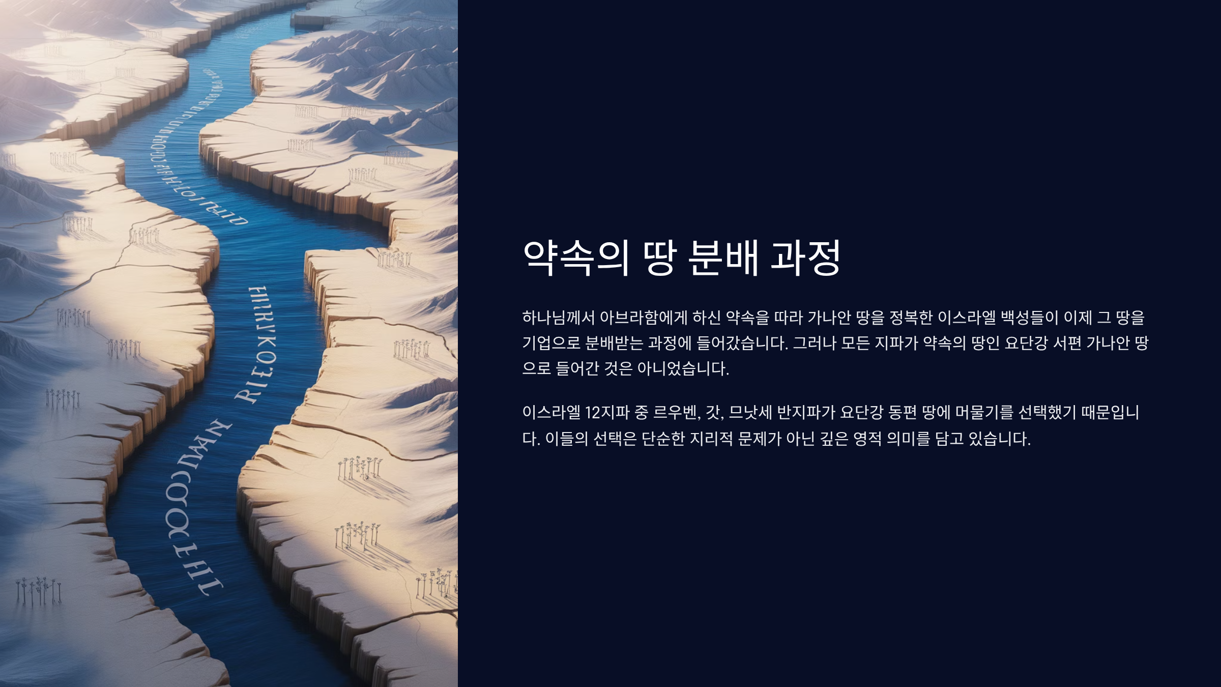 하나님께 이스라엘의 조상 아브라함에게 하신 약속을 따라 가나안 땅을 정복하게 된 이스라엘 백성은 이제 그 땅을 기업으로 분배받는 과정에 들어가게 된다. 이것이 여호수아서 13장부터 24장까지 나온다. 그러나 모든 지파가 약속의 땅인 요단강 서편에 있는 가나안 땅으로 들어간 것은 아니었다. 왜냐하면 이스라엘의 12지파들 중에 르우벤, 갓, 그리고 므낫세 반지파가 요단강 동편 땅에 머물기를 선택했기때문이다. 그런데 이들의 선택은 단순히 지리적인 문제가 아니라 깊은 영적인 의미를 담고 있다. 하나님께서 본래 계획하신 약속의 땅이 아닌, 자신들의 눈에 좋아 보이는 땅을 선택한 이들의 이야기는 오늘날 우리 신앙인들에게 중요한 질문을 던지게 된다. 우리는 과연 하나님의 약속 그 자체를 소망하고 있는가, 아니면 나의 경험과 익숙함이 주는 안정감을 더 추구하고 있는가? 그래서 이번 시간에는 요단 동편 땅 분배 사건을 통해, 우리가 진정으로 분배받아야 할 영원한 기업이 어떤 것이어야 하는지 심도 있게 조명하고자 한다.