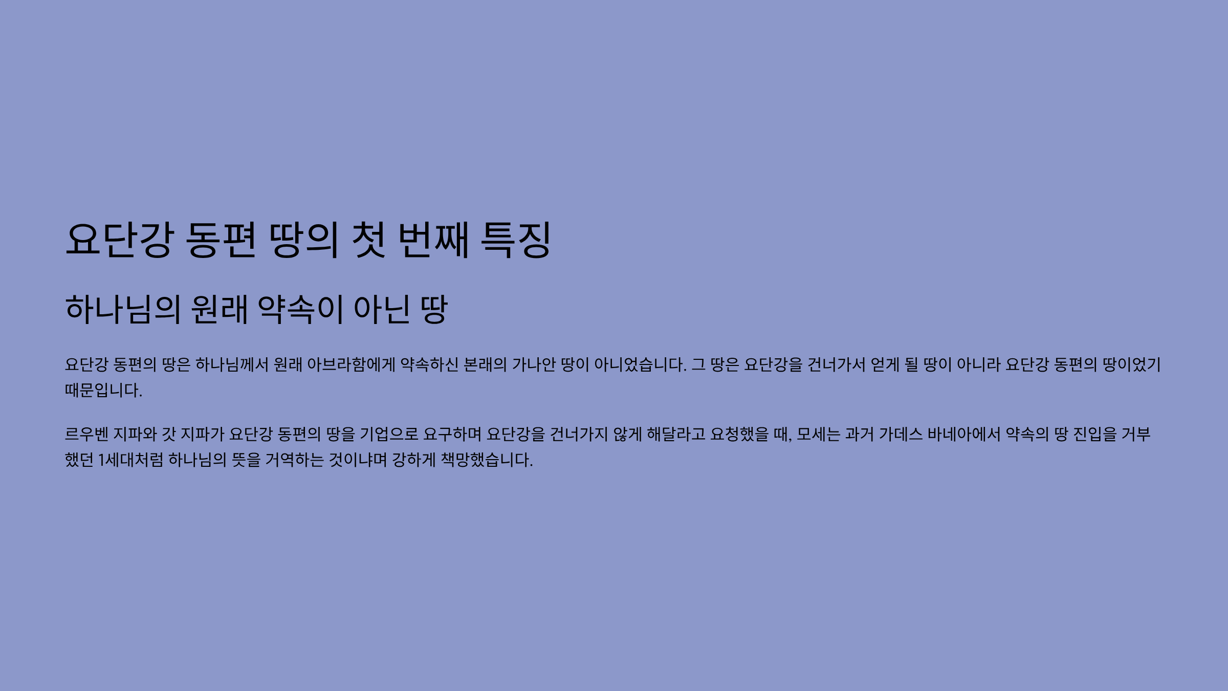 첫째, 요단강 동편의 땅은 하나님께서 원래 아브라함에게 약속하신 본래의 가나안 땅이 아니었다는 것이다(창 15:18). 왜냐하면 그 땅은 요단강을 건너가서 얻게 될 땅이 아니라 요단강 동편의 땅이었기 때문이다(민32:7,9). 이때 르우벤 지파와 갓 지파는 요단강 동편의 땅을 그들의 기업으로 요구했고 자기들은 요단강을 건너가지 않게 해 달라고 요청했다(민 32:5). 그러자 모세는 이들의 요구를 듣고, 과거 가데스 바네아에서 약속의 땅에 들어가기를 거부했던 1세대처럼 하나님의 뜻을 거역하는 것이냐며 강하게 책망을 하였다. 이는 이들의 선택이 하나님의 약속의 경계 밖으로 벗어나려는 위험한 시도였다는 사실을 보여주는 것이다.