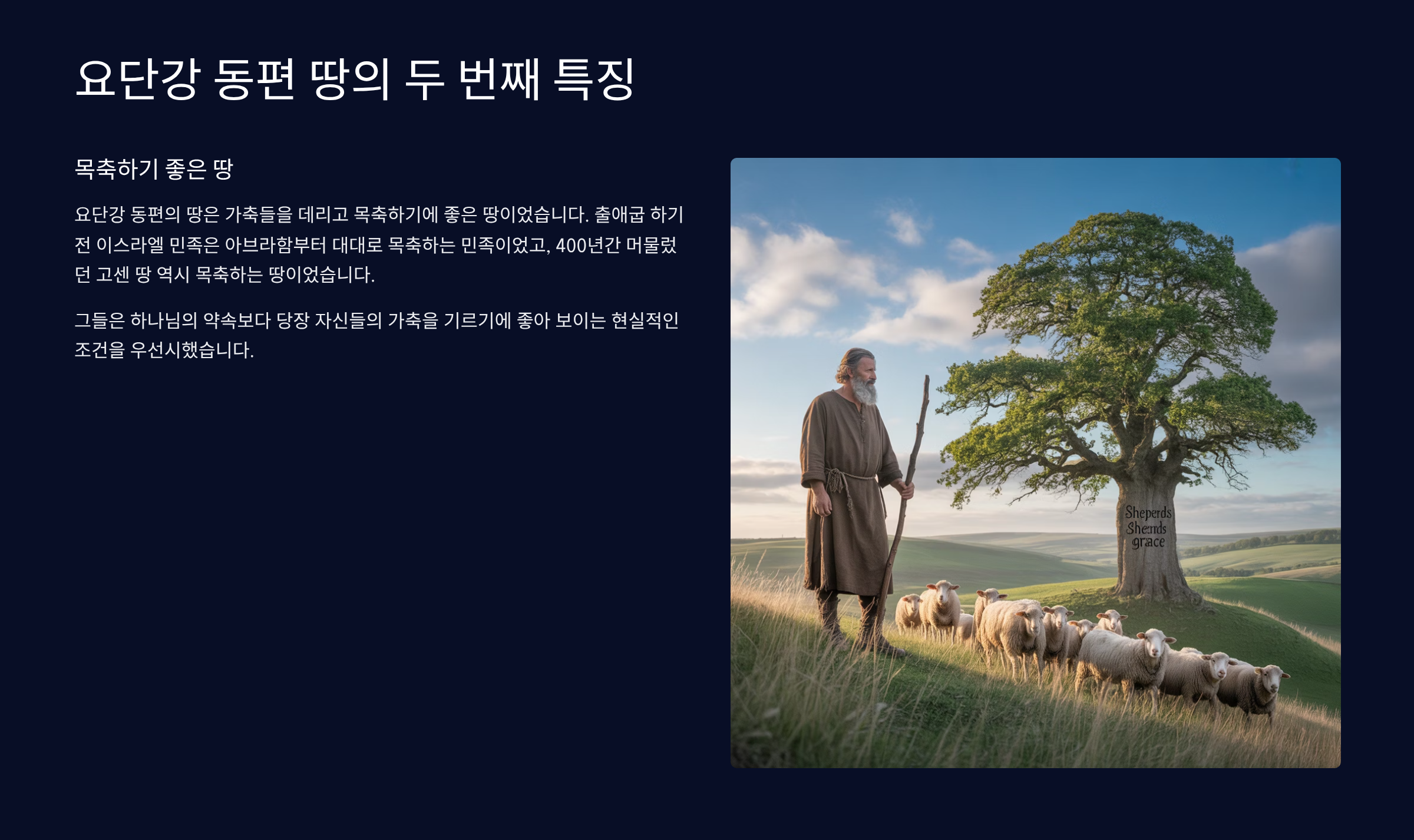 둘째, 요단강 동편의 땅은 가축들을 데리고 목축하기에 좋은 땅이었다는 사실이다(민 32:4). 왜냐하면 출애굽 하기 전에 이스라엘 민족은 아브라함부터 대대로, 목축하는 민족과 나라였기 때문이다(창 47:3~6). 그리고 그 민족이 400년간 머물렀던 고센 땅 역시 목축을 하난 땅이었기 때문이다. 그러므로 그들은 하나님의 약속보다 당장 자신들의 가축을 기르기에 좋아 보이는 현실적인 조건을 우선시했던 것이다. 고로 그들이 요단 동편 땅을 택한 근본적인 이유는 그 땅이 '목축하기에 좋은 땅'이었기 때문임을 알 수 있다. 대대로 목축업을 해왔던 그들에게, 익숙한 삶의 방식을 그대로 유지할 수 있는 환경은 매우 매력적이었다. 그러나 하나님의 약속은 이스라엘 백성을 더 이상 유목민이 아닌, 젖과 꿀이 흐르는 땅에 정착하여 새로운 삶을 살게 하시는 것이었다. 그들은 하나님이 예비하신 새로운 미래보다 과거로부터 이어져 온 익숙한 삶의 방식에 안주하기를 원했다. 이는 변화를 두려워하고 하나님의 새로운 인도하심보다 자신의 경험과 편안함을 의지하려는 인간의 연약한 본성을 보여준다.이는 오늘날 성도들이 영원한 천국 기업보다 이 땅에서의 부와 성공, 안락한 삶을 더 추구하는 모습과 다르지 않다.