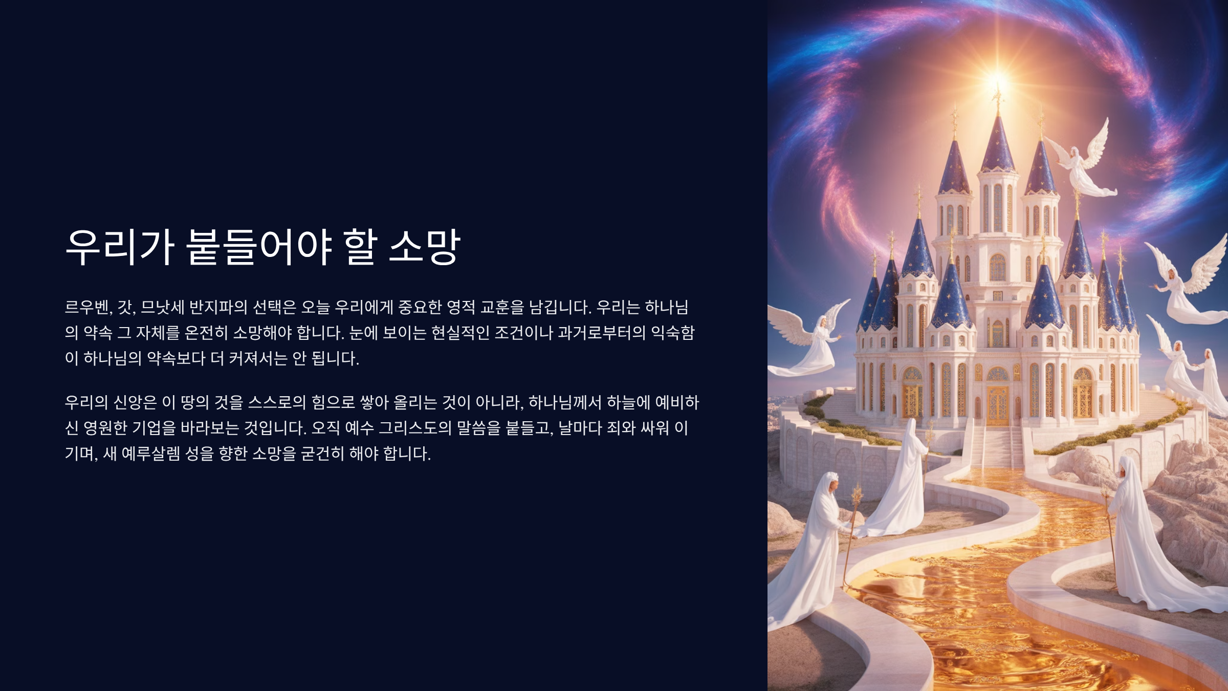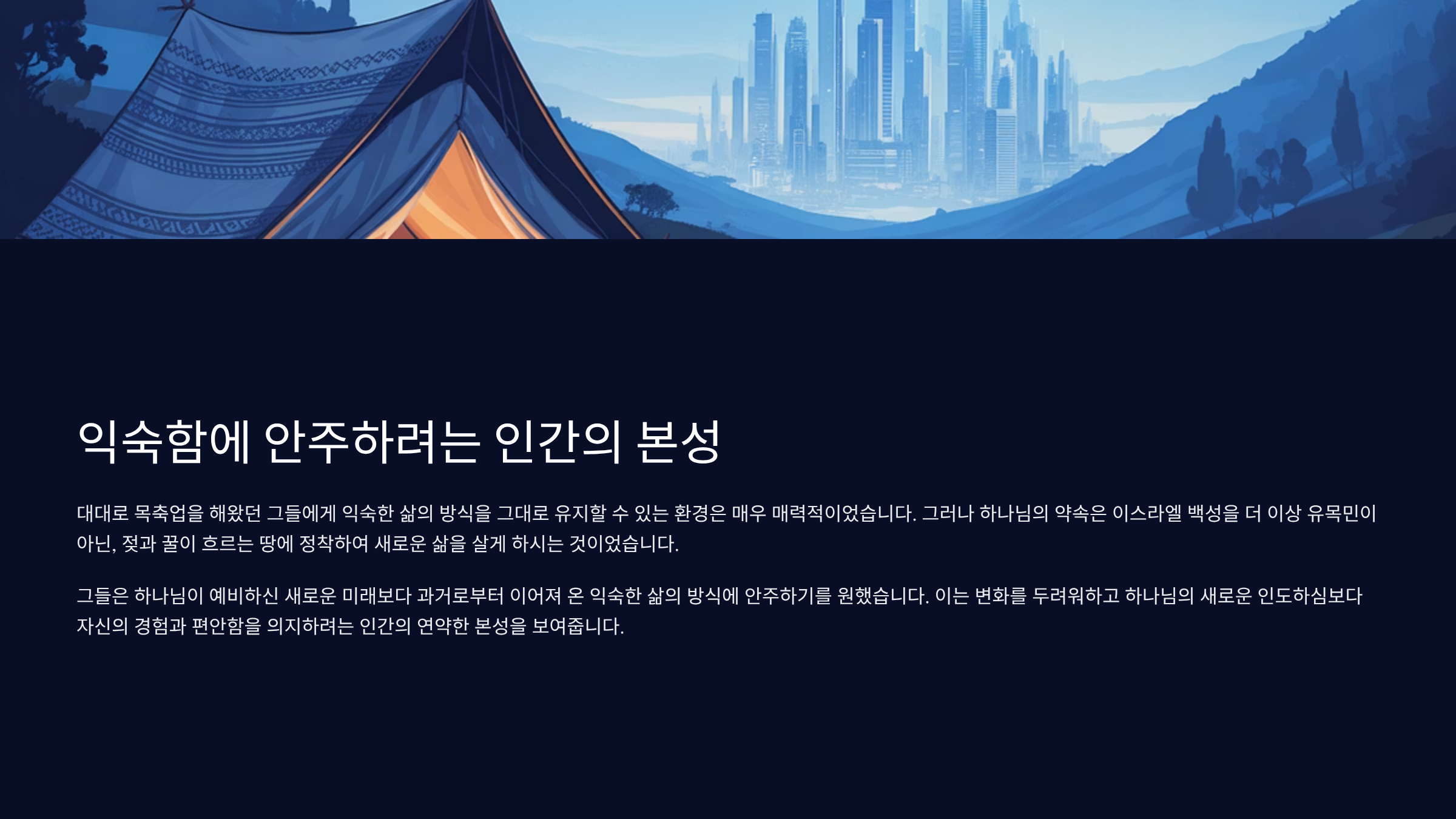 르우벤, 갓, 므낫세 반지파의 선택은 오늘 우리에게 중요한 영적 교훈을 남긴다. 우리는 하나님의 약속 그 자체를 온전히 소망해야 한다. 눈에 보이는 현실적인 조건이나 과거로부터의 익숙함이 하나님의 약속보다 더 커져서는 안 된다. 우리의 신앙은 이 땅의 것을 스스로의 힘으로 쌓아 올리는 것이 아니라, 하나님께서 하늘에 예비하신 영원한 기업을 바라보는 것이다. 율법에 갇혀 자기만의 신앙을 만들거나, 죄를 회개하지 않고 익숙한 죄악에 머무는 삶은 결국 우리를 약속의 땅에서 멀어지게 할 뿐이다. 오직 예수 그리스도의 말씀을 붙들고, 날마다 죄와 싸워 이겨 악한 영들을 쫓아내며, 새 예루살렘 성을 향한 소망을 굳건히 해야 한다. 우리 모두가 익숙함의 유혹을 떨치고 일어나 요단강을 건너, 하나님께서 예비하신 약속의 땅에 온전히 들어가는 복된 성도가 되어야 할 것이다.