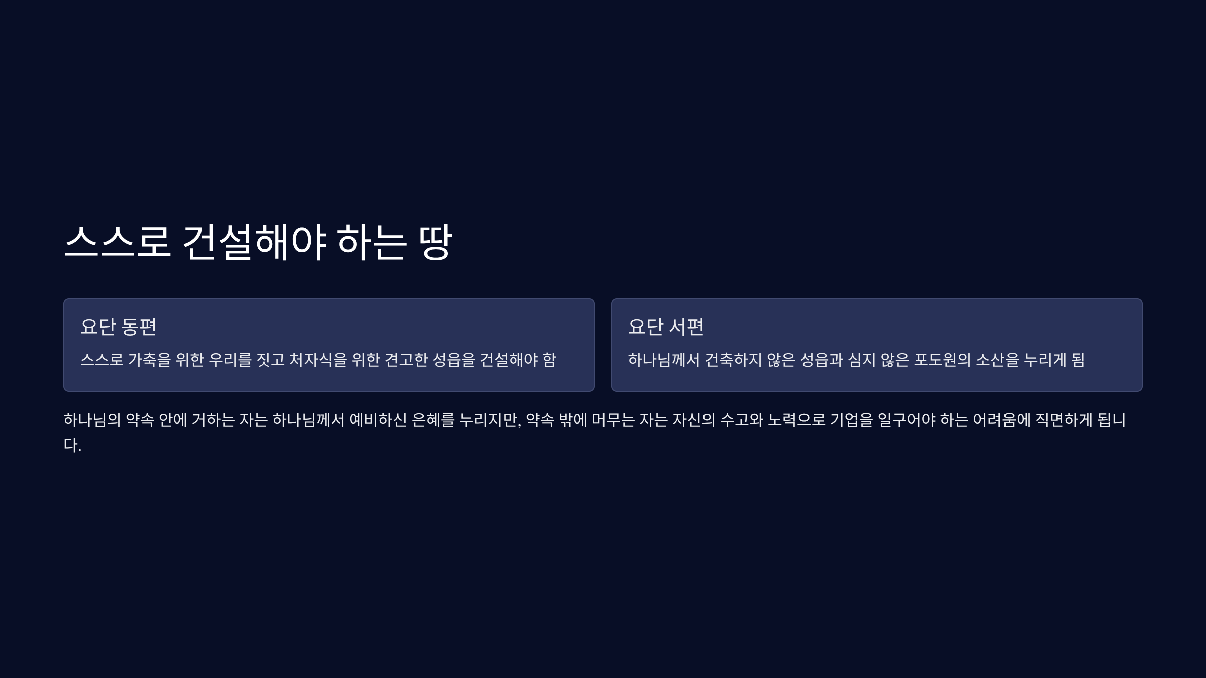 셋째, 요단 동편의 땅은 스스로가 가축을 위해서 우릿간을 짓고 처자식을 위해서 견고한 성읍을 건설해야 하는  땅이었다는 사실이다. (민 32:16~17, 24~24, 26). 이는 요단 동편 땅과 서편 땅의 결정적인 차이가 무엇인지를 알려주는데 그것은 '누가 그 땅을 준비했는가'이다. 하나님께서는 요단 서편의 가나안 땅에 대해, 이스라엘이 건축하지 않은 성읍과 심지 않은 포도원의 소산을 누리게 될 것이라고 약속하셨다. 즉, 약속의 가나안 땅은 하나님께서 모든 것을 완벽하게 준비해 놓으신 땅이었다. 반면, 요단 동편을 선택했던 지파들은 "우리 가축을 위해 우리를 짓고 우리 어린 아이들을 위하여 성읍을 건축하고" (민 32:16) 라고 말하며, 스스로 자신들의 터전을 일구어야 했다. 이는 영적으로 중요한 차이를 시사한다. 하나님의 약속 안에 거하는 자는 하나님께서 예비하신 은혜를 누리지만, 약속 밖에 머무는 자는 자신의 수고와 노력으로 기업을 일구어야 하는 어려움에 직면하게 되기 때문이다.
