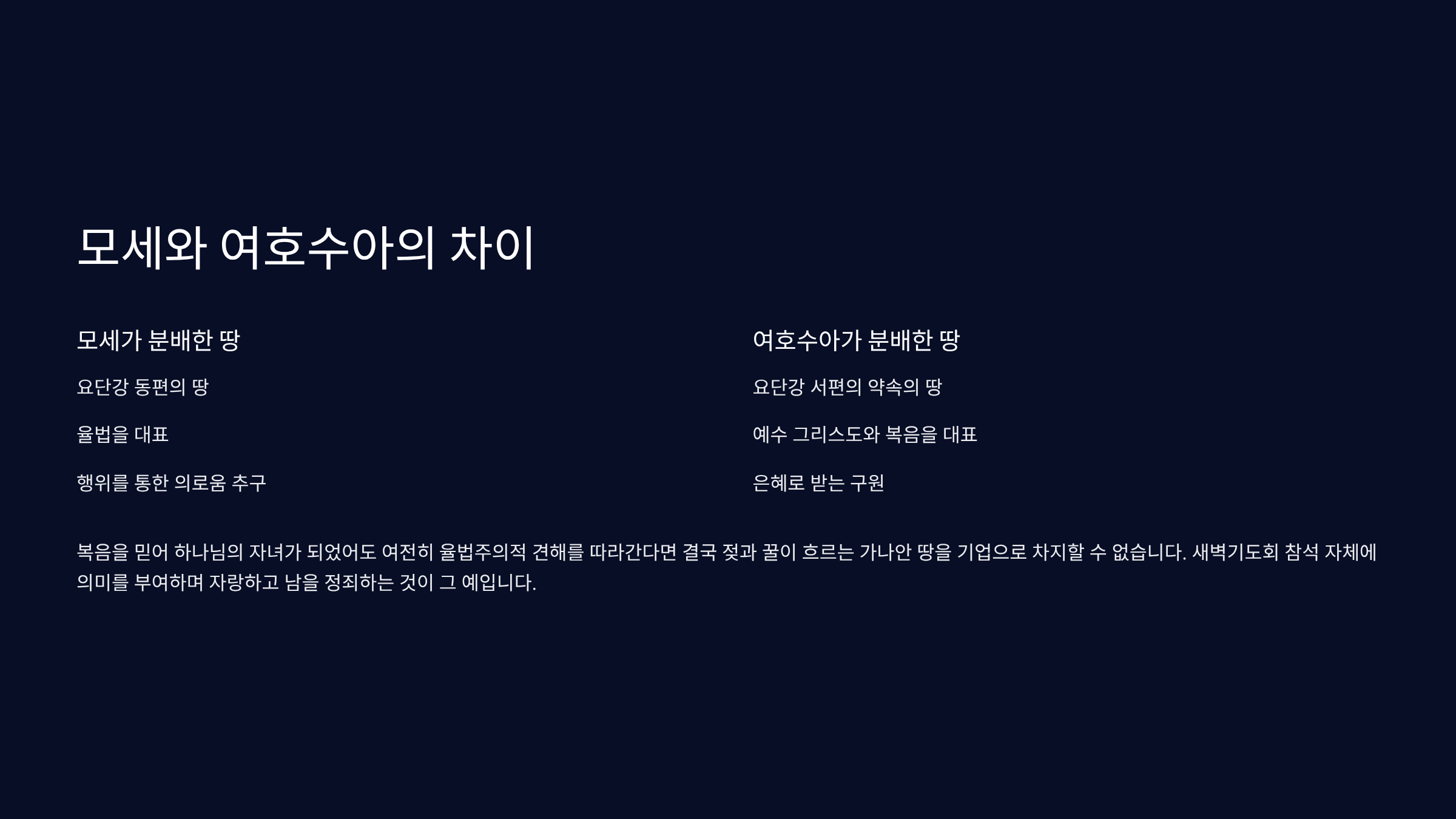 넷째, 요단 동편의 땅은 모세가 기업으로 분배해준 땅이었다는 사실이다(민 32:33, 수 13:1, 15, 24, 29). 그런데 요단강 서편의 약속으 땅은 여호수아가 분배해준 땅이다. 여기서 '모세'는 율법을 대표하고, '여호수아'는 예수 그리스도와 복음을 대표한다. 이것은 오늘날 우리 성도들이 복음을 믿어 하나님의 자녀가 되었어도 여전히 율법의 잘못된 견해를 따라간다면 결국에 젖과 꿀이 흐르는 가나안 땅을 기업으로 차지할 수 없음을 시사해준다. 여기서 '율법의 잘못된 견해를 따라가는 것'은 오늘날에 복음을 듣더라도 어떤 행위들을 통해 의롭다함을 얻으려는 시도를 가리킨다. 예를 들어. "나는 새벽기도를 다니니까 너보다 경건해"라고 생각하는 것이다. 이 사람에게서는 새벽기도회에 나오긴 나왔는데, 이때 어떤 말씀을 듣고 어떻게 기도했는지가 중요한 것이 아니라 새벽기도에 나왔다는 것 자체에 의미를 부여하고, 그것으로 자신을 자랑하고 그것을 하지 못하는 사람을 정죄하는 것을 가리킨다. 그러므로 율법주의적으로 살고 있는 사람은 본인이 비록 하나님의 자녀가 되었다고 할지라도 결국 약속의 땅인 천국에 들어가지 못하게 되는 것이다. 자, 이후에 있어진 두 지파 반의 이야기를 살펴보자. 두 지파 반은 모세와의 약속대로, 가나안 정복 전쟁에 선봉으로 참여하여 젖과 꿀이 흐리는 가나안 땅에서 7년간 함께 싸웠다. 그들은 전쟁의 의무를 다했지만, 전쟁이 끝난 후 그들이 돌아간 곳은 약속의 땅이 아닌 자신들이 선택한 요단 동편이었을 뿐이다. 이는 매우 심각한 영적 의미를 말해준다. 이는 교회 공동체 안에서 함께 신앙생활을 하고, 영적 전쟁에 참여하며, 동일한 사역을 감당했을지라도, 그 마음의 중심이 어디를 향하고 있느냐에 따라 마지막에 얻는 기업이 달라질 수 있다는 것을 보여주기 때문이다.