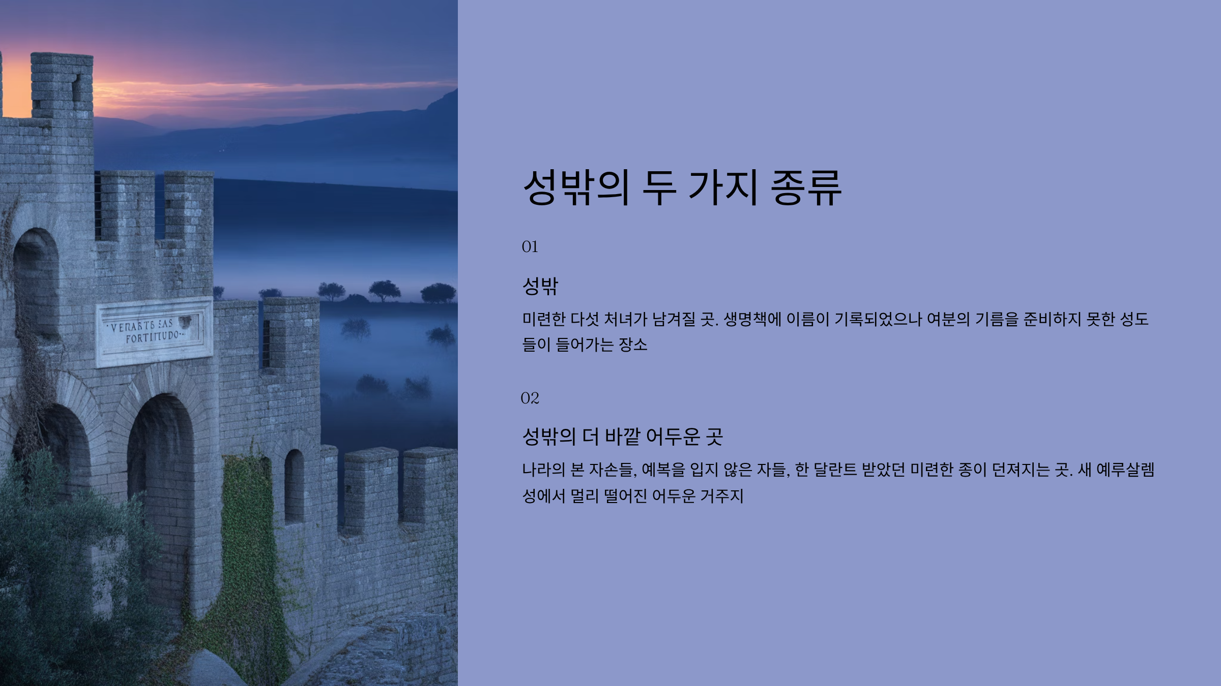 첫째, 성밖이 있다. 그럼, 이곳은 어떤 장소이며 누가 던져지는 곳인가? 그곳은 마25장에 나오는 '미려한 다섯처녀'가 남겨지게 될 바로 그 성밖의 땅이다(마25:10). 이곳에 던져지게 될 자는 생명책에 이름이 기록되었던 하나님의 자녀이긴 하였지만 그리고 심지어 주님의 재림을 기다리는 마음도 갖고 있는 성도였지만 결국 살아있을 때에 날마다 조금씩 조금씩 여분의 기름을 준비하지 못했던 미련한 다섯 처녀들이 들어가게 되는 장소이다. 그러나 슬기로운 처녀들은 반대로 어떻게 했는가? 이들도 다른 미려한 다섯 처녀들처럼 주님의 재림을 기다렸지만 그들은 자기 안에 이미 들어있는 성령으로 만족하지 않고 날마다 땀과 눈물과 기도와 섬김과 사명을 감당으로 자신의 기름병에 여분의 기름을 채워넣어둔 자들이었다.
