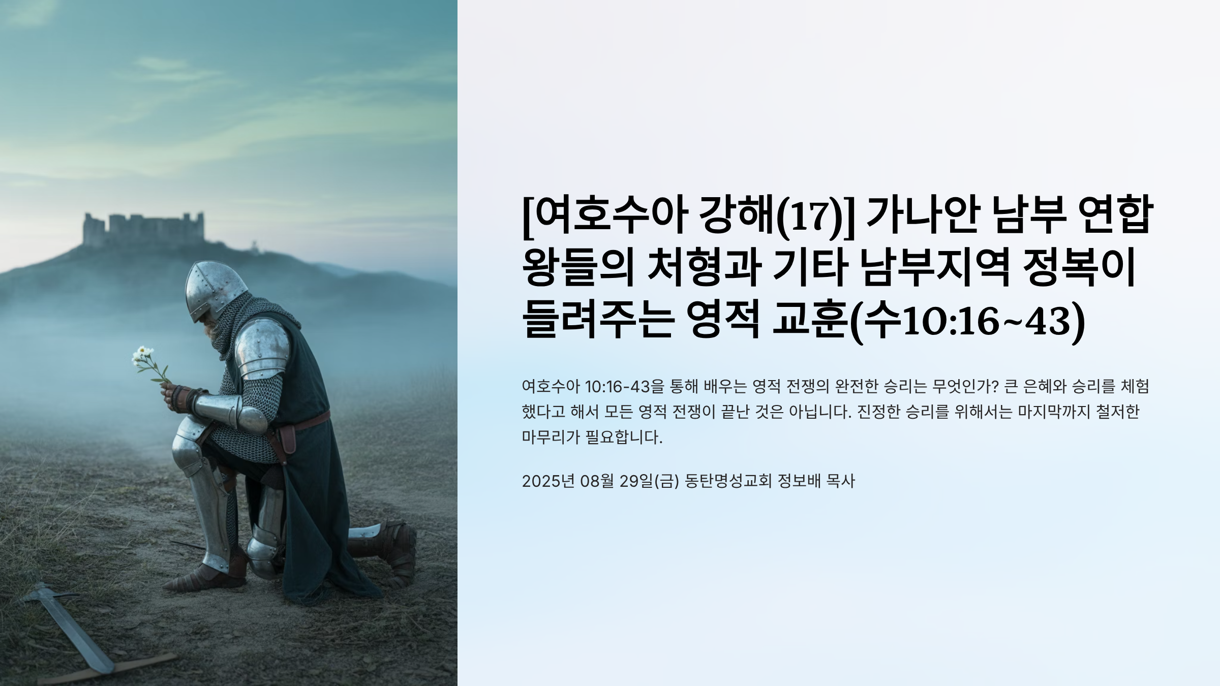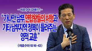 제목: [여호수아 강해(17)] 가나안 남부 연합왕들의 처형과 기타 남부지역 정복이 들려주는 영적 교훈(수10:16~43)_동탄명성교회 정보배목사