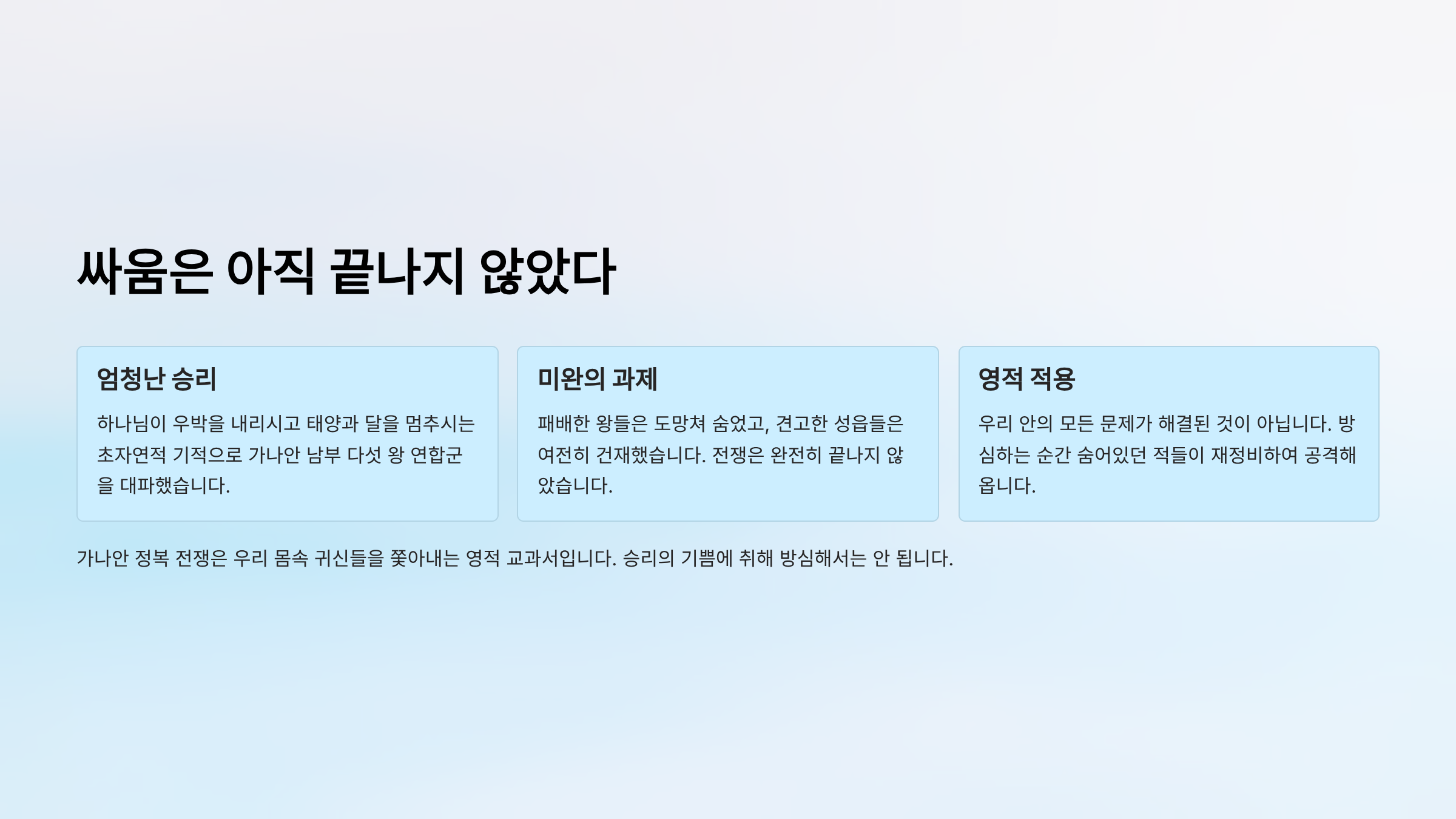 가나안 정복 전쟁은 우리 몸속에 있는 귀신들을 어떻게 쫓아낼 것인가에 대한 영적 교과서와 같다. 우리는 지난 시간에 가나안 남부의 다섯 왕이 연합하여 이스라엘을 대적했으나, 하나님께서 하늘에서 우박을 내리시고 태양과 달을 멈추시는 초자연적인 기적으로 함께 싸우심으로 이스라엘이 대승을 거두는 장면을 살펴보았다. 엄청난 승리였지만, 그것으로 전쟁이 완전히 끝난 것은 아니었다. 패배한 적의 왕들은 도망쳐 숨었고, 그들이 다스리던 견고한 성읍들은 여전히 건재했기 때문이다. 이것은 오늘날 우리의 영적 싸움에서도 동일하게 나타나는 현상이다. 큰 은혜를 체험하고 기도 응답을 받아 영적 승리를 맛보았다고 해서, 우리 안의 모든 문제가 해결된 것은 아니다. 승리의 기쁨에 취해 방심하는 순간, 숨어있던 적들은 재정비하여 우리를 다시 공격해온다.