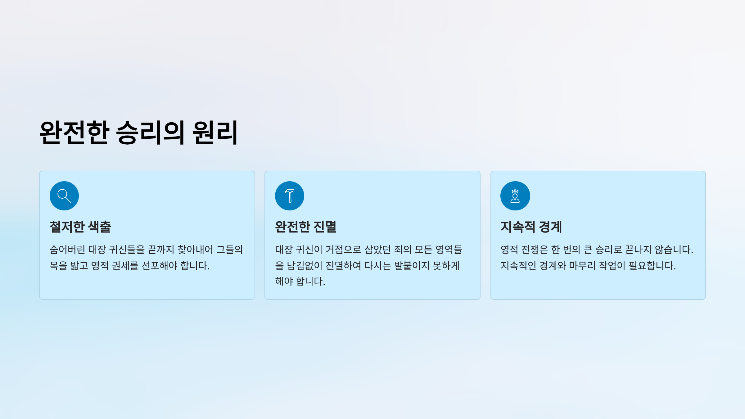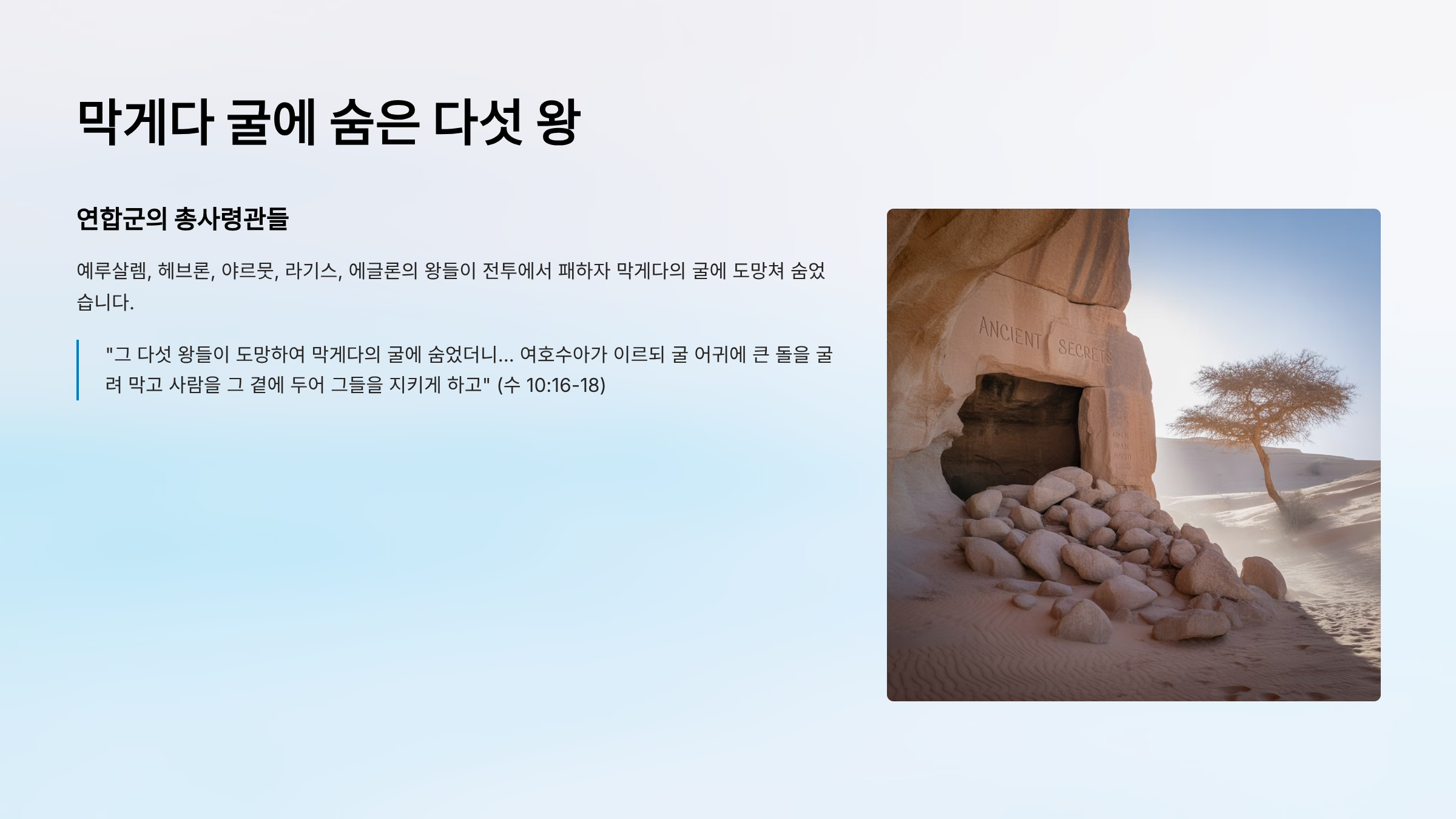 지금 다루고 있는 본문인 여호수아 10장 16절부터 43절까지의 말씀은, 바로 이 승리 이후의 ‘마무리 과정’이 얼마나 중요한지를 생생하게 보여준다. 이스라엘은 어떻게 도망쳐 숨은 왕들을 처리했으며, 남아있는 적의 도시들을 어떻게 정복했는가? 이 과정 속에는 우리 몸속에 숨어있는 ‘대장 귀신’들을 처리하고, 그들이 거점으로 삼고 있던 ‘귀신의 집’을 파괴하는 영적 전쟁의 매우 구체적이고 실제적인 원리를 우리는 배우게 될 것이다. 이 시간 이 말씀을 통해, 영적 전쟁의 완전한 승리를 위한 마지막 단계를 배우고 적용함으로써, 다시는 적에게 발목 잡히지 않는 견고한 믿음의 용사로 세워지기를 바란다.