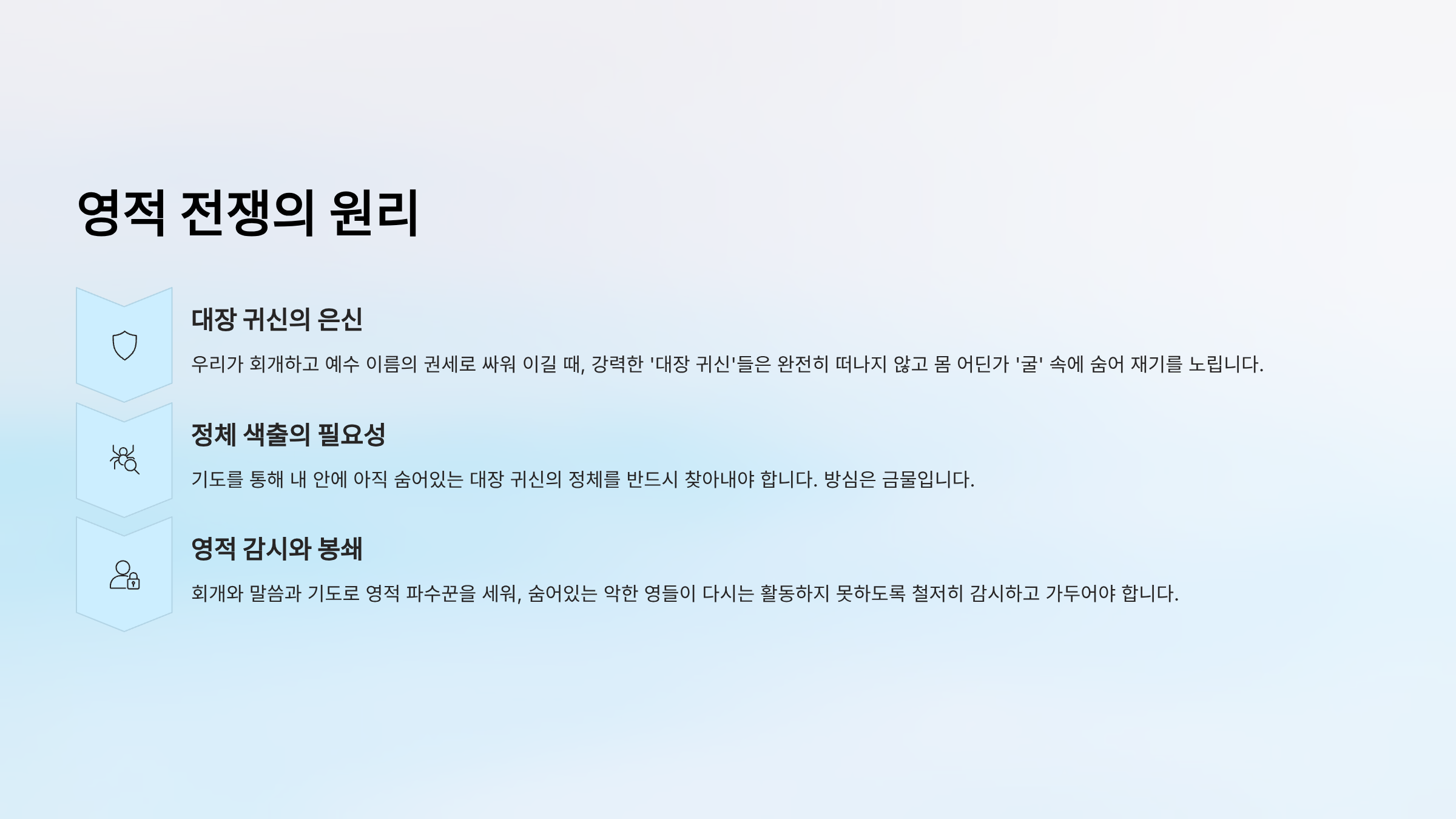 이것은 우리 몸속에서 일어나는 영적 전쟁의 원리를 정확히 보여준다. 우리가 회개하고 예수 이름의 권세로 악한 영들과 싸워 이길 때, 모든 귀신이 다 즉시 떠나가는 것이 아니다. 특히 우리 가문 대대로 내려오며 죄의 통로 역할을 했던 강력한 ‘대장 귀신’들은, 싸움에서 지더라도 완전히 떠나지 않고 우리 몸 어딘가에 있는 ‘굴’ 속에 숨어서 재기할 기회를 노린다. 그러므로 우리는 영적 승리 후에 결코 방심해서는 안 된다. 기도를 통해 내 안에 아직 숨어있는 대장 귀신이 누구인지, 그 정체를 반드시 색출해내야 한다. 그리고 여호수아가 굴 어귀를 큰 돌로 막고 사람을 두어 지키게 한 것처럼, 우리도 회개와 말씀과 기도로 영적인 파수꾼을 세워, 숨어있는 악한 영들이 다시는 활동하지 못하도록 철저히 감시하고 가두어 두어야 한다.