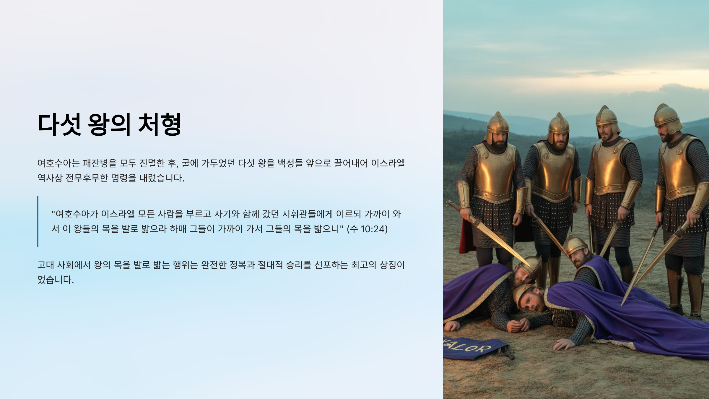 여호수아는 패잔병들을 모두 진멸하고 돌아온 후에, 굴에 가두었던 다섯 왕을 백성들 앞으로 끌어내었다. 그리고 그는 모든 군 지휘관에게 이스라엘 역사상 전무후무한 명령을 내린다.