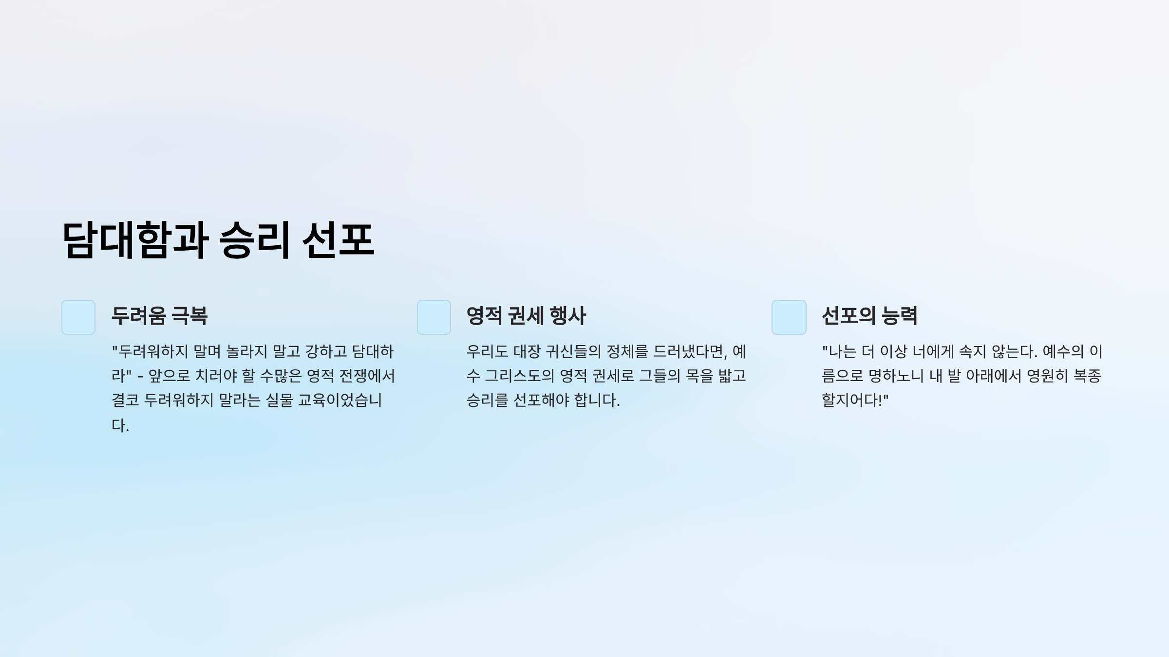 본 설교는 가나안 남부 정복의 마무리 과정(수10:16-43)을 통해, 영적 전쟁의 마지막 단계를 구체적으로 설명한다. 막게다 굴에 숨은 다섯 왕은, 큰 싸움에서 진 뒤에도 우리 몸속에 숨어 재기를 노리는 ‘대장 귀신’을 상징한다. 그러므로 완전한 승리를 위해서는 첫째, 이 숨은 대장 귀신을 끝까지 색출하여 가두어야 한다. 둘째, 왕들의 목을 발로 밟듯, 예수 이름의 권세로 대장 귀신을 완전히 제압하고 승리를 선포하여 두려움을 이겨내야 한다. 셋째, 남부의 모든 성읍을 진멸했듯이, 대장 귀신이 거점으로 삼았던 죄의 습관과 통로, 즉 ‘귀신의 집’을 남김없이 파괴해야 한다. 이 모든 과정은 우리를 위해 싸우시는 하나님을 의지할 때 가능하다.