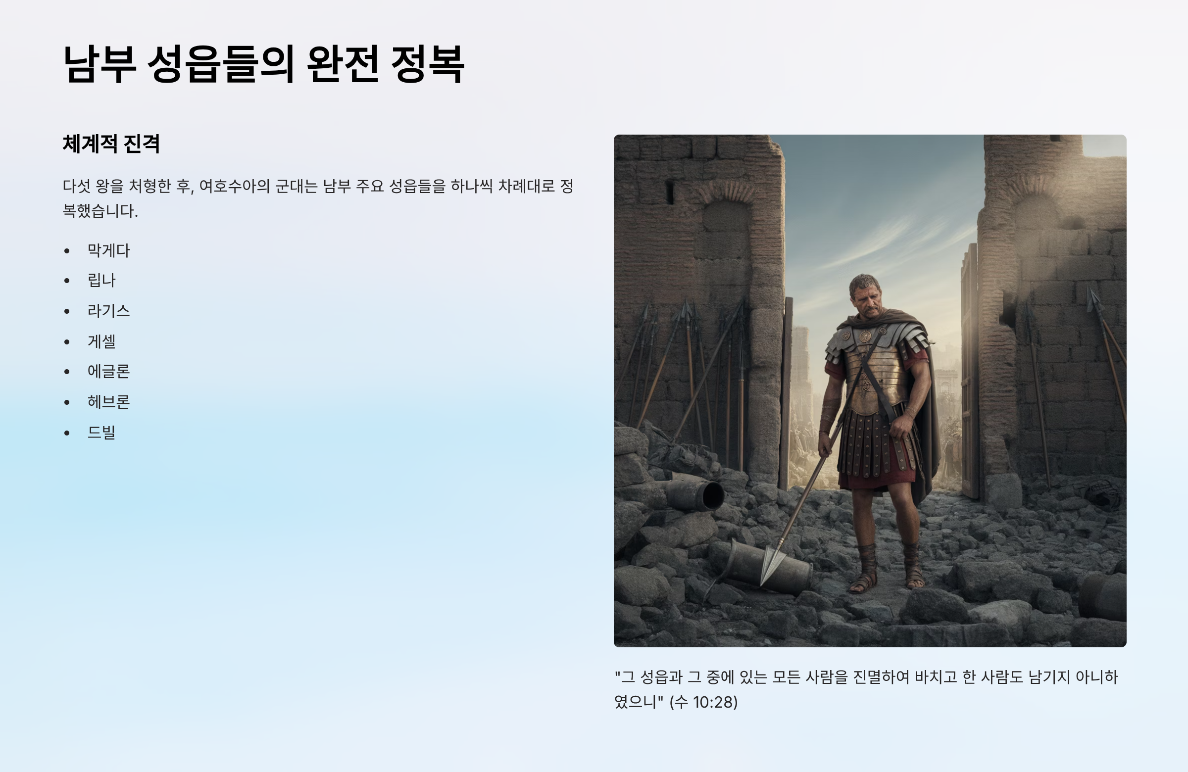 가나안 남부 정복의 마지막 과정은 우리에게 완전한 승리를 위한 영적 마무리가 얼마나 중요하고 구체적이어야 하는지를 가르쳐준다. 영적 전쟁은 한 번의 큰 승리로 끝나지 않는다. 승리 후에 숨어버린 대장 귀신들을 끝까지 색출하여 그들의 목을 밟고 영적 권세를 선포해야 한다. 그리고 그들이 거점으로 삼았던 죄의 모든 영역들을 남김없이 진멸하여 다시는 발붙이지 못하게 해야 한다. 이 모든 놀라운 승리는 어떻게 가능했는가? 성경은 그 이유를 단 한 문장으로 명확하게 요약한다.