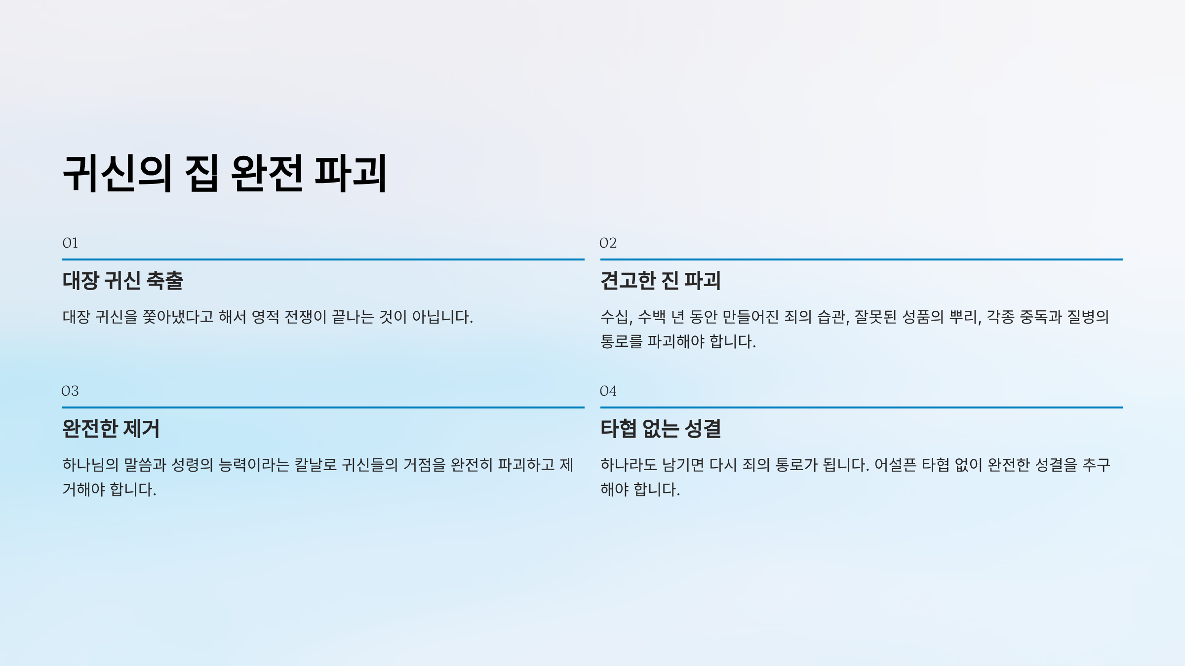 이것은 우리 몸속에 있는 ‘귀신의 집’을 파괴하는 것을 상징한다. 대장 귀신을 쫓아냈다고 해서 영적 전쟁이 끝나는 것이 아니다. 그 대장 귀신이 수십, 수백 년 동안 우리 가문과 우리 삶 속에 만들어 놓은 견고한 진, 즉 죄의 습관, 잘못된 성품의 뿌리, 각종 중독과 질병의 통로 등 귀신들이 거점으로 삼았던 ‘성읍들’을 하나님의 말씀과 성령의 능력이라는 칼날로 완전히 파괴하고 제거해야 한다. 만약 하나라도 남겨두면, 그것이 다시 죄의 통로가 되어 다른 귀신들을 불러들이는 빌미를 제공하게 된다. ‘하나도 남기지 않고 다 진멸했다’는 말씀처럼, 우리는 영적 전쟁에서 어설픈 타협 없이 완전한 성결을 추구해야만 한다.