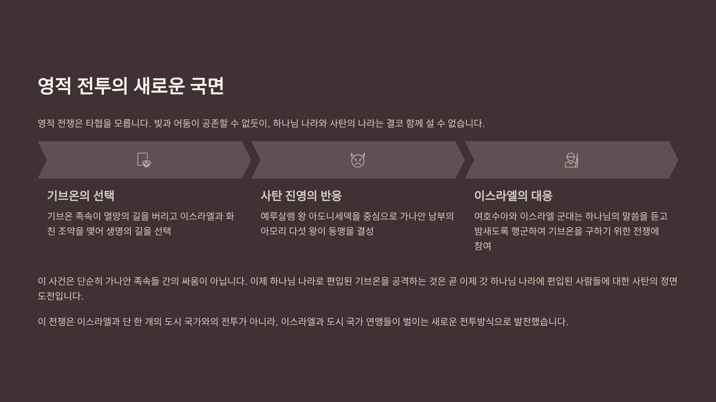 영적 전쟁은 타협을 모른다. 빛과 어둠이 공존할 수 없듯이, 하나님 나라와 사탄의 나라는 결코 함께 설 수 없다. 기브온 족속이 멸망의 길을 버리고 이스라엘과 화친 조약을 맺어 생명의 길을 선택하자, 사탄의 진영은 즉각적인 반응을 보인다. 예루살렘 왕 아도니세덱을 중심으로 한 가나안 남부의 아모리 다섯 왕이 동맹을 결성하고, 배신자 기브온을 응징하기 위해 총공격에 나선 것이다.
