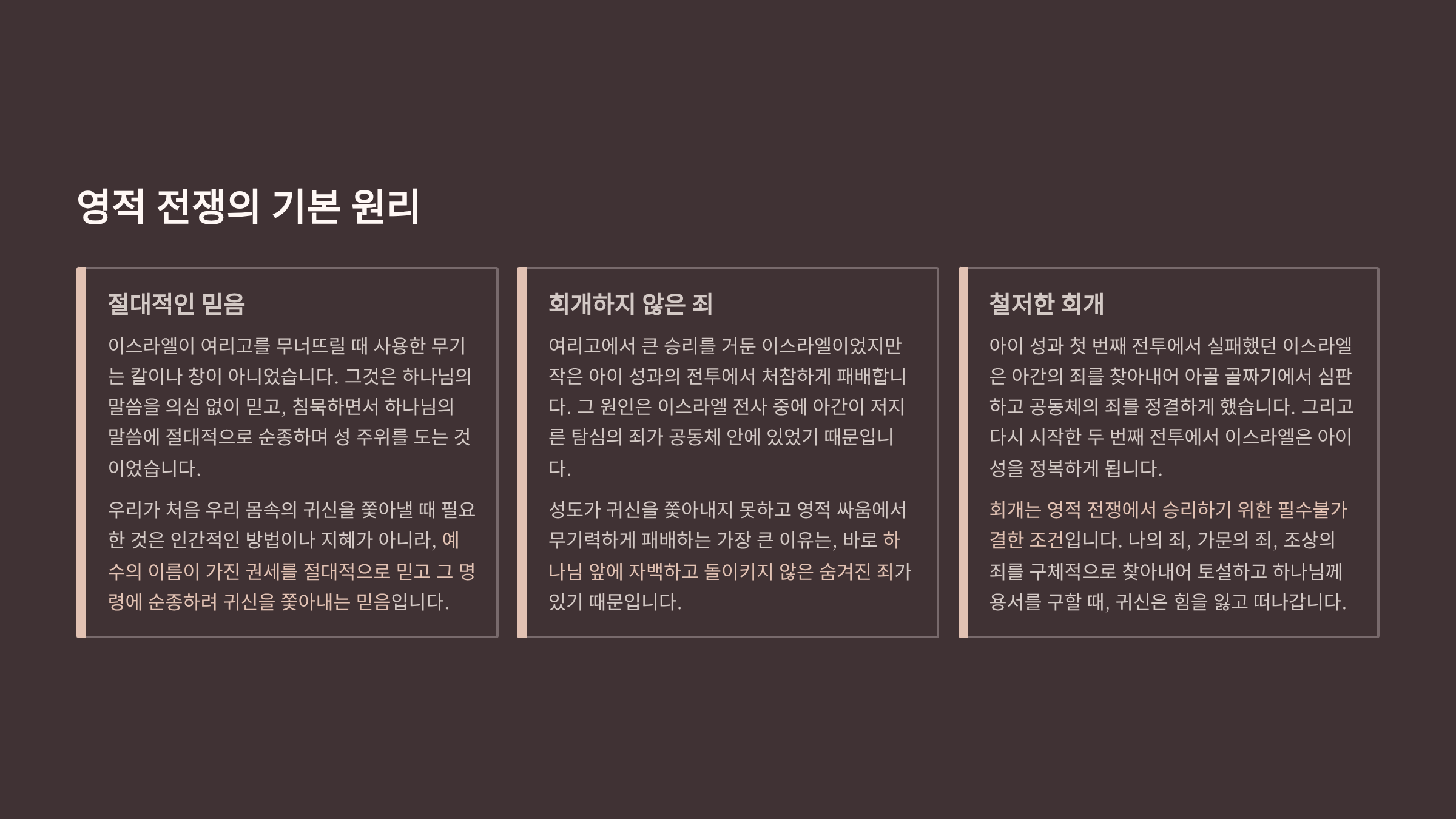 가나안 정복, 즉 내 안의 귀신을 쫓아내는 영적 전쟁을 치를 때에는 우리는 먼저 영적 전투에서 승리하기 위한 기본 원리를 숙지해야 한다. 그것은 3가지다.
