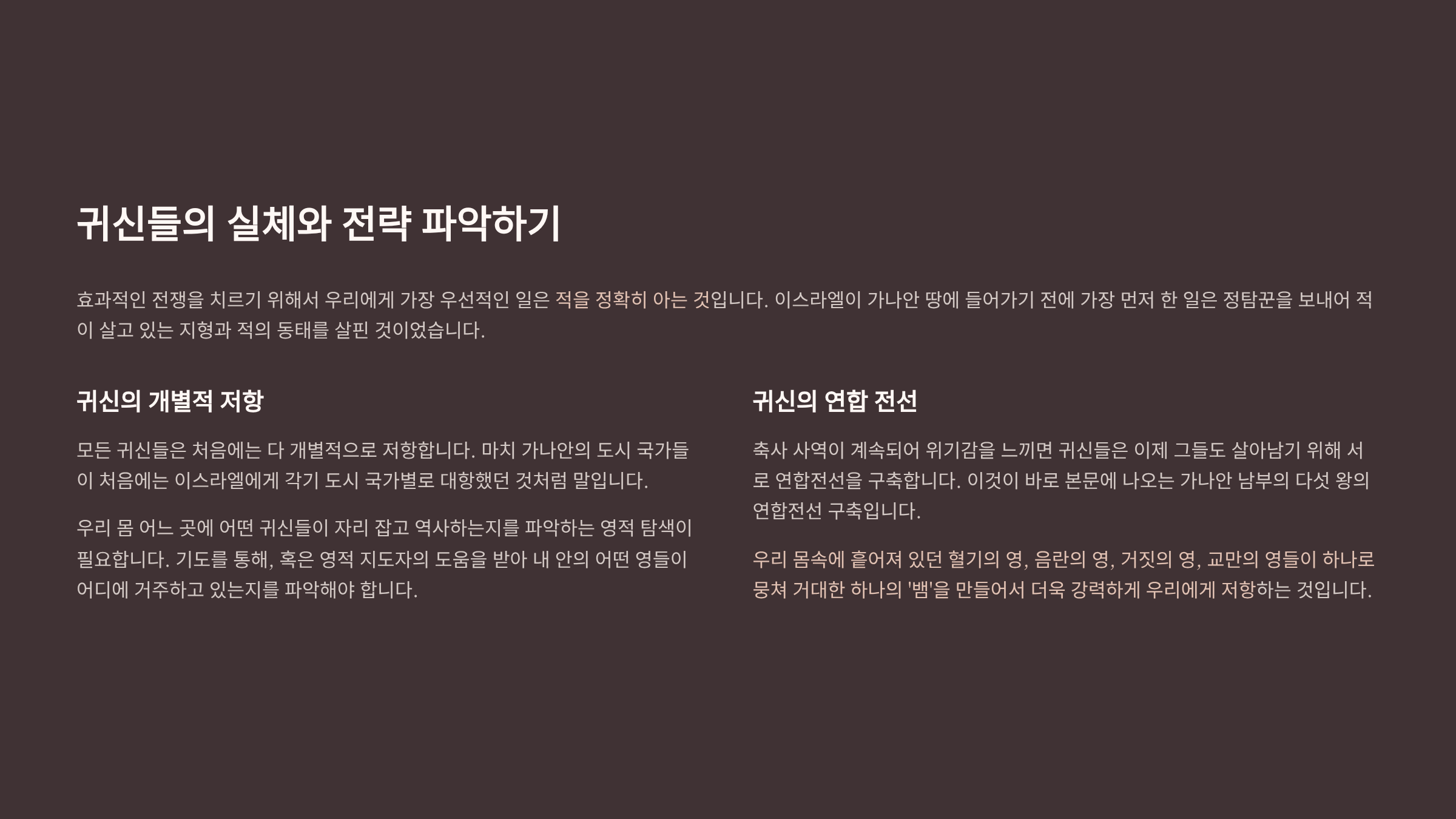 효과적인 전쟁을 치르기 위해서 우리에게 가장 우선적인 일은 적을 정확히 아는 것이다. 그러므로 이스라엘이 가나안 땅에 들어가기 전에 가장 먼저 한 일은 정탐꾼을 보내어 적이 살고 있는 지형과 적의 동태를 살핀 것이었다. 이처럼 우리 또한 내 몸 어느 곳에 어떤 귀신들이 자리 잡고 역사하는지를 파악하는 영적 탐색이 필요하다. 기도를 통해, 혹은 영적 지도자의 도움을 받아 내 안의 어떤 영들이 어디에 거주하고 있는지를 파악해야 한다. 그리고 나를 반복적으로 넘어지게 하는 죄의 뿌리는 대체 어떤 귀신의 역사인지를 분별해야 하는 것이다.